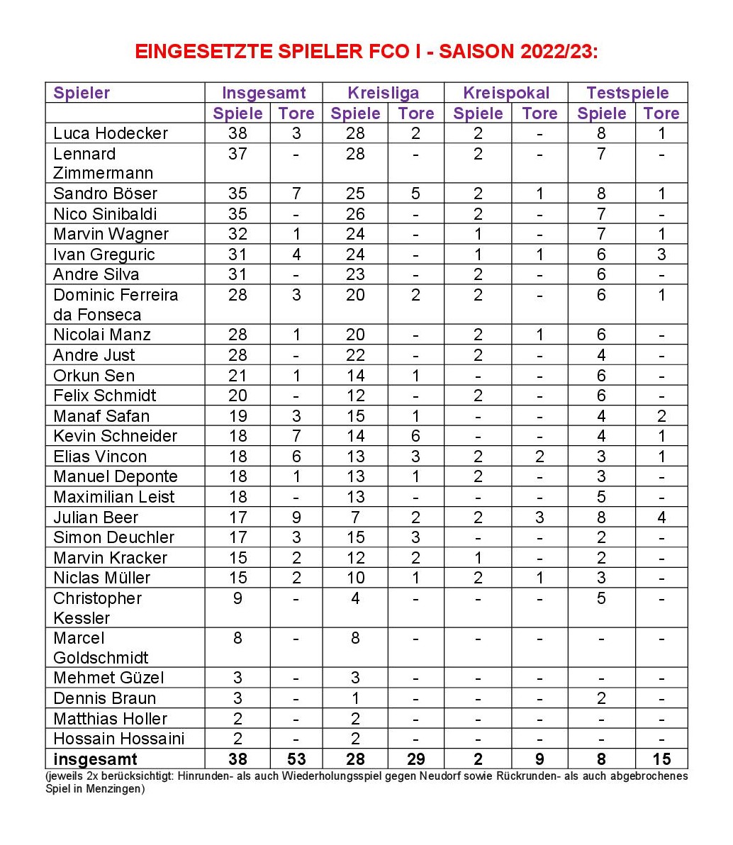 27 Spieler und damit 5 mehr als in der Vorsaison schnürten in der Kreisliga für unseren FCO ihre Kickschuhe. Alle 28 Spiele (Wiederholungsspiele doppelt berücksichtigt) bestritten Hodecker und Zimmermann. Sinibaldi kam auf 26 und Böser auf 25 Kreisligaeinsätze. Je 24 Kreisligaspiele bestritten Wagner und Greguric, Kapitän Silva kam auf 23, Just auf 22 und Ferreira da Fonseca und Manz auf je 20. Auf mehr als die Hälfte der Kreisligaspiele kamen sonst nur noch und dies ganz knapp, Safan und Deuchler (je 15). Damit konnten nur 10 Spieler weitestgehend die Vor- als auch Rückrunde bestreiten. Ein weiterer klarer Fingerzeig für den zu engen Kader und dafür, dass eben diese 10 äußerst beansprucht waren und am Ende dann auch ihrem leeren Tank Tribut zollen mussten. Inkl. Pokal und Tests bestritt unser FCO in dieser Saison 38 Spiele, in denen die besagten 27 Akteure zum Einsatz kamen. Die Bestwerte hier (nur > 30 Spiele berücksichtigt): Hodecker (38, also kein einziges Mal gefehlt!), Zimmermann (37, nur ein Testspiel verpasst), Böser und Sinibaldi (je 35), Wagner (32) sowie Greguric und Silva (je 31). Siehe hierzu auch das beigefügte Foto „Eingesetzte Spieler“.
