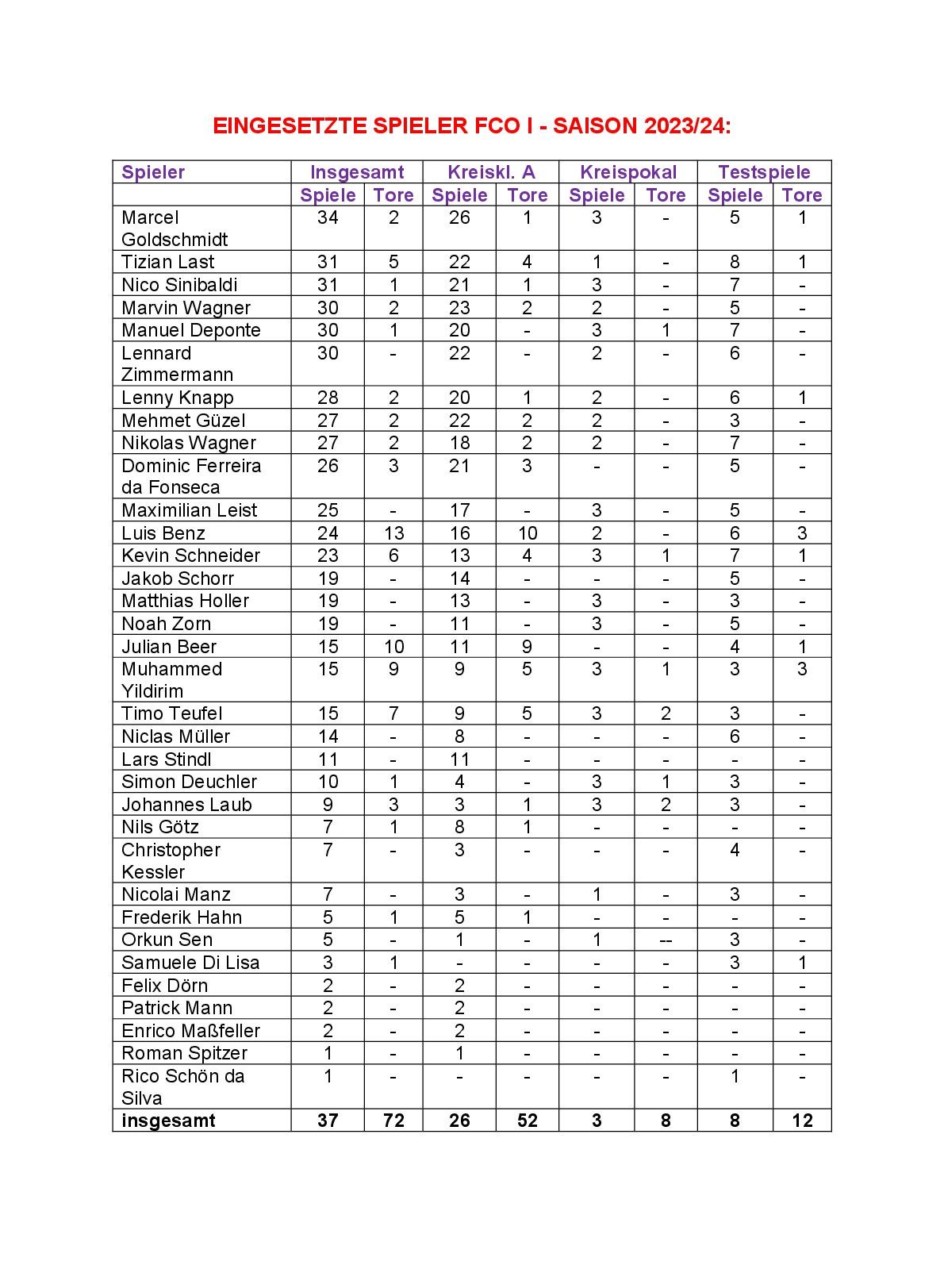 32 Spieler schnürten in der A-Klasse für unseren FCO ihre Kickschuhe. Alle 26 Spiele bestritt einzig Capitano Goldschmidt. Den zweitbesten Wert weist M. Wagner auf (23), gefolgt von Güzel, Last, Zimmermann (je 22), Ferreira da Fonseca, Sinibaldi (21), Knapp und Deponte (je 20). Weniger als 20, aber immerhin noch mindestens 50 % der Begegnungen absolvierten N. Wagner (18), Leist (17), Benz (16), Schorr (14), Holler und Schneider (je 13). Damit standen 15 Mann mindestens eine Halbserie auf dem Platz. Inkl. Pokal und Tests bestritt unser FCO in dieser Saison 37 Spiele, hierbei kamen 34 Spieler zum Einsatz. Die Bestwerte hier (nur > 30 Spiele berücksichtigt): Goldschmidt (34), Last, Sinibaldi (je 31), Deponte, M. Wagner und Zimmermann (je 30). Siehe hierzu auch das beigefügte Foto „Eingesetzte Spieler“.