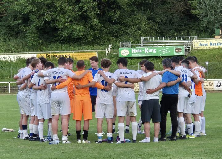 Zur Pause 5 weitere Wechsel. Im Tor Jakob Schorr für Kessler und sonst noch Maximilian Leist für Frank, Stadtmüller für Manuel Deponte, Schön da Silva für Marvin Wagner und Kevin Schneider (nach fast fünfmonatiger Verletzungspause) für Krasniqi. Leist war nun mit 27 Jahren der Älteste auf dem Platz, Ferreira da Fonseca mit 21 der zweitälteste. Die Spielführerbinde von Deponte übernahm N. Wagner. In der 50sten kein schlechter Abschluss von Schneider, aber übers Tor. Der VfB-Torhüter führte den Abstoß kurz aus und erhielt von seinem Abwehrmann wieder den Rückpass. Last roch den Braten, lief an, der Torhüter zögerte kurz und schoss dann „Tize“ an, von dessen Körper das Spielgerät den Weg ins Tor fand = 1:0. Leider sorgte die Führung nicht für die nötige Ruhe und nach zuvor guter Balleroberung wurde der Ball in Minute 57 schnell wieder verloren. Die Rauenberger verlagerten von links nach rechts und die von dort Flanke fand halblinks im Strafraum einen Gästeangreifer. In dessen Torschussversuch warf sich ein Odenheimer, wehrte dabei aber unübersehbar die Kugel per Hand ab. Der Schiri ließ weiterlaufen (wohl Vorteilsregel) und die nächsten zwei Schüsse wurden jeweils von Schorr stark pariert. Unsere Abwehr leistete leider zu wenig Gegenwehr, sodass Schuss #3 schließlich unhaltbar zum 1:1 im rechten oberen Tordreieck landete. Unser junges Team war sehr motiviert, zumeist aber zu übermotiviert, sodass die nächsten Minuten eher von wilder Natur waren. Nach einem Ballverlust im Mittelfeld und deren schnellem Konter dann in der 63sten eine richtig gute Chance für die Gäste mit einem guten Abschluss aus im Strafraum halbrechter Position. Schorr war mit einer starken Parade aber zur Stelle und rettete zur Ecke. In der 67. Minute kam der leicht angeschlagene Luis Benz neu ins Spiel (für Baumann) und gleich 4 Mann kehrten wieder aufs Feld zurück: Frank, Knapp, M. Wagner und Krasniqi für Fergin, Zorn, Ferreira da Fonseca und Last. In den letzten rund 20 Minuten spürte man beiden Mannschaften die frühe Vorbereitungsphase an, das Tempo war nun nicht mehr so hoch wie zuvor. Unserem Team gelang es dabei aber auch immer mal wieder Ruhe ins eigene Spiel zu bringen, vereinzelt wollte man dann aber in gewissen Situationen doch wieder zu viel und wählte überhastete Lösungen, anstelle mal ruhig einen Angriff aufzubauen. Hier gilt es künftig das richtige Mittelmaß zu finden. In der 80. und 90+2. Minute dennoch noch zwei gute Offensivaktionen unseres FCO: Zunächst Benz mit einer guten Einzelaktion und einem Schlenzer aus 18 Metern, der rund zwei Meter rechts am Tor vorbeiging. Kurz vor Schluss wurde eine Ecke von Schön da Silva abgewehrt und M. Wagner zog über rechts nochmals auf. Die Hereingabe konnte nur zu kurz geklärt werden, was Benz von der Strafraumgrenze zentral die Möglichkeit eröffnete. Seinen zu zentralen, aber durchaus strammen Schuss parierte der VfB-Keeper sicher. Kurz darauf erfolgte der Schlusspfiff einer sehr fairen Partie. Dem VfB Rauenberg wünschen wir eine gute und verletzungsfreie Saison.