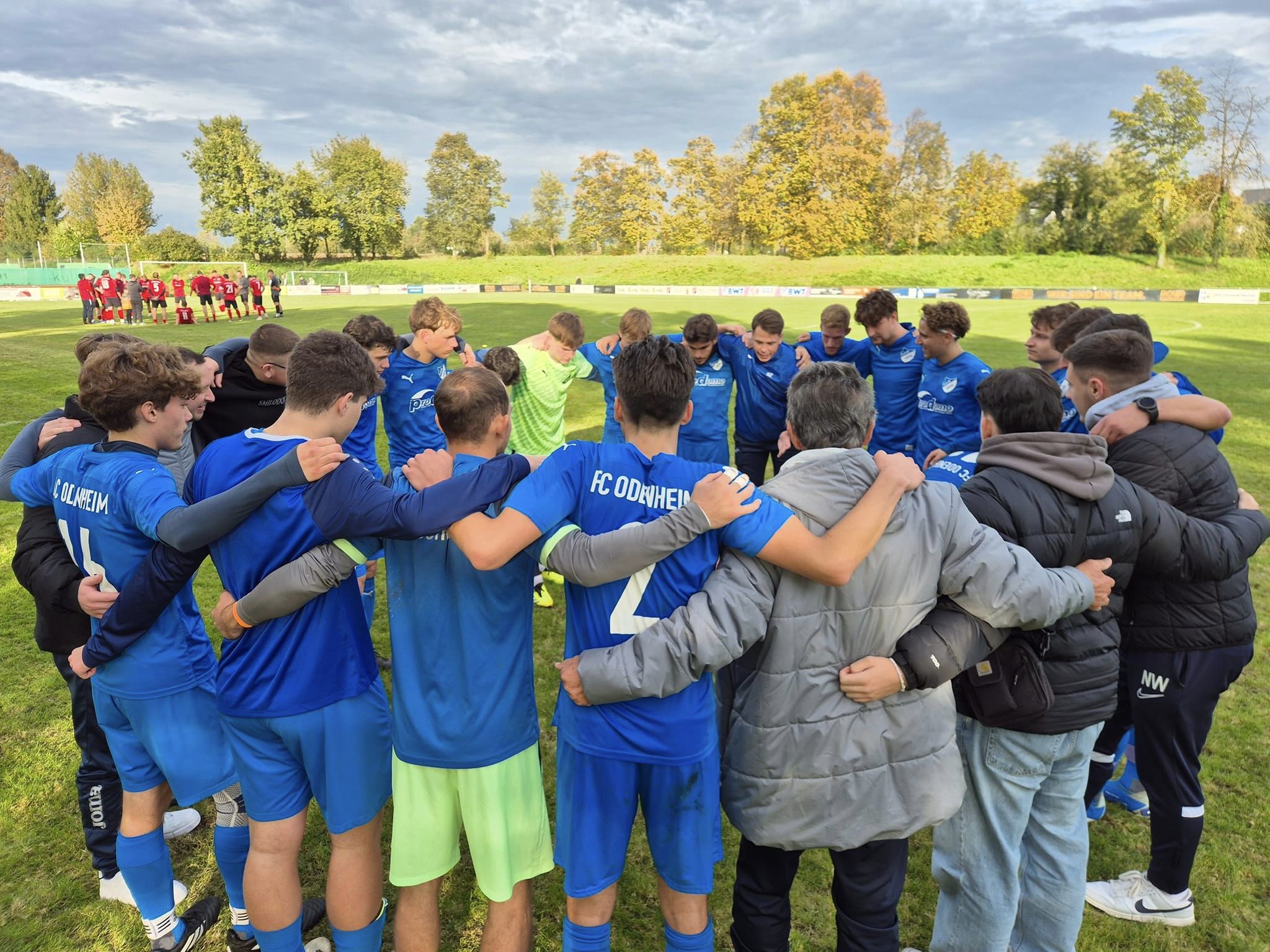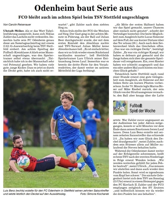 Nachdem es in den letzten Tagen weitere kleine Motivationshilfen gegeben hatte, schickte Trainer Zabler sein von zahlreichen FCO-Anhängern begleitetes Team entsprechend fokussiert aufs Feld im Augarten. Vom Anpfiff weg war unverkennbar, dass da heute mit den körperlich starken Stettfeldern eine harte Nuss geknackt werden muss. In den Anfangsminuten war es zunächst ein Abtasten der gegenseitigen Stärken und Schwächen, ehe unser Team in Minute 8 einen blitzsauberen Treffer zum 0:1 erzielen konnte. Noah Zorn setzte die linke Außenlinie entlang Luis Benz in Szene. Was dieser dann hier gegen seinen unstrittig starken Gegenspieler machte, war allererste Sahne. Fast blind dann auch noch das Verständnis mit Beer. Dieser lief im exakt richtigen Moment links in den Strafraum ein, bekam genau auf den Punkt das Zuspiel von Beer und ließ mit einem Schuss ins lange Eck die Odenheimer und ihre Fans erstmals jubeln. Wahrlich ein richtig geiler Treffer in Entstehung und Vollendung, wie man ihn in der A-Klasse ganz gewiss nur selten sieht. Die Gastgeber waren danach bemüht, besaßen gegen gutstehende Viktorianer aber nicht die benötigten Ideen. Nach einer knapp zehnminütigen Verschnaufpause waren es vielmehr die FCO´ler, die auch in offensiver Sicht endgültig die Spielkontrolle erlangten. So in der 17. Minute ein starker Angriff unserer Mannen. Die Stettfelder Hintermannschaft konnte zunächst klären, Dominic Ferreira da Fonseca angelte sich jedoch den Ball und stürmte dynamisch rechts in den Strafraum. Hier behielt er die gebotene Ruhe und wartete, bis ihm der vor allem in Hälfte 1 bärenstarke Beer etwas anbot. Dieser dann angespielt, zog kurz auf und schloss verdeckt aus 15 Metern ab. Der Torwart gut am Boden und sicher. In der 22. Spielminute machte Kevin Schneider rechts an der Mittellinie vor unserer Trainerbank einen Ball gut fest und leitete auf rechts zu Beer weiter. Dieser lief, begleitet von einem Stettfelder Verteidiger, aufs Tor zu. Im Strafraum angekommen bot sich unserem Co-Spielertrainer die Abschlusschance, „Jule“ zog aber nochmals auf und blieb dann am grätschenden Stettfelder hängen. Schade, dies wäre fast das 0:2 gewesen. In der 24sten der erste Torabschluss der Heimmannschaft. Unser Mittelfeld hatte einem Stettfelder zuviel Raum erlaubt und dieser schloss nach seinem Lauf durchs Zentrum aufs FCO-Tor ab. Jakob Schorr packte aber sicher zu. In der 27. Minute behauptete sich Schneider erneut Höhe der Mittellinie und passte auf rechts zu Beer. Dieser lief ein paar Meter und spielte dann einen fast perfekten Querpass in den Lauf von Benz. Einer von zwei ihn begleiteten Gegenspielern konnte aber gerade noch so klären. Rund 35 Minuten lang hatte unser FCO die Spielkontrolle besessen und führte bis dato absolut verdient. Dann aber eine etwa fünf-/siebenminütige starke Phase des TSV. In der 35sten entfachte dieser bei zwei Eckbällen viel Druck und kam dabei zu drei, vier Abschlüssen im und knapp außerhalb des Strafraums. Unsere vielbeinige Abwehr hatte Schwerstarbeit zu verrichten, konnte aber letztlich jeden Ball blocken. 120 Sekunden später ein guter Diagonalpass der Stettfelder auf links. Von dort kam die direkte Hereingabe in die Box, wo ein Angreifer wohl zu einer vielversprechenden Gelegenheit gekommen wäre. Dieser rutschte aber aus, Chance damit vertan. In diese erste Drangphase der Gastgeber dann aber ebenso fast die Torchance für unseren FCO. Beer setzte dabei den letzten Mann der Heimelf gehörig unter Druck. Dessen Rückpass zum Torwart kam zwar an, setzte aber wiederum diesen unter großen Druck, da Beer auch hier nachsetzte. Wenn es gewollt gewesen wäre, was dann passierte, dann Chapeau, aber letztlich war es wohl doch eher Glück, dass der Torwart den Ball durch Beers Beine spitzeln konnte und die aufkommende Gefahr damit getilgt war. Nur eine Zeigerumdrehung danach aber die erste dicke Möglichkeit für Stettfeld, als nach einer Hereingabe von rechts ein Stürmer ca. 7 Meter vor dem Tor schneller am Ball war, diesen aber knapp übers FCO-Gehäuse bugsierte. In diesen Minuten hatte unserem FCO der Zugriff vor allem im Mittelfeld gefehlt und bei doch Ballgewinnen, agierte man viel zu überhastet, sodass man zu keinen Entlastungsangriffen kam. In den letzten Minuten vor dem Halbzeitpfiff ging es dann wieder ruhiger zu. Unser FCO führte nach 45 Minuten verdient mit 0:1, aber es war klar, dass noch 45 weitere schwere Minuten auf unser junges Team zukommen werden.