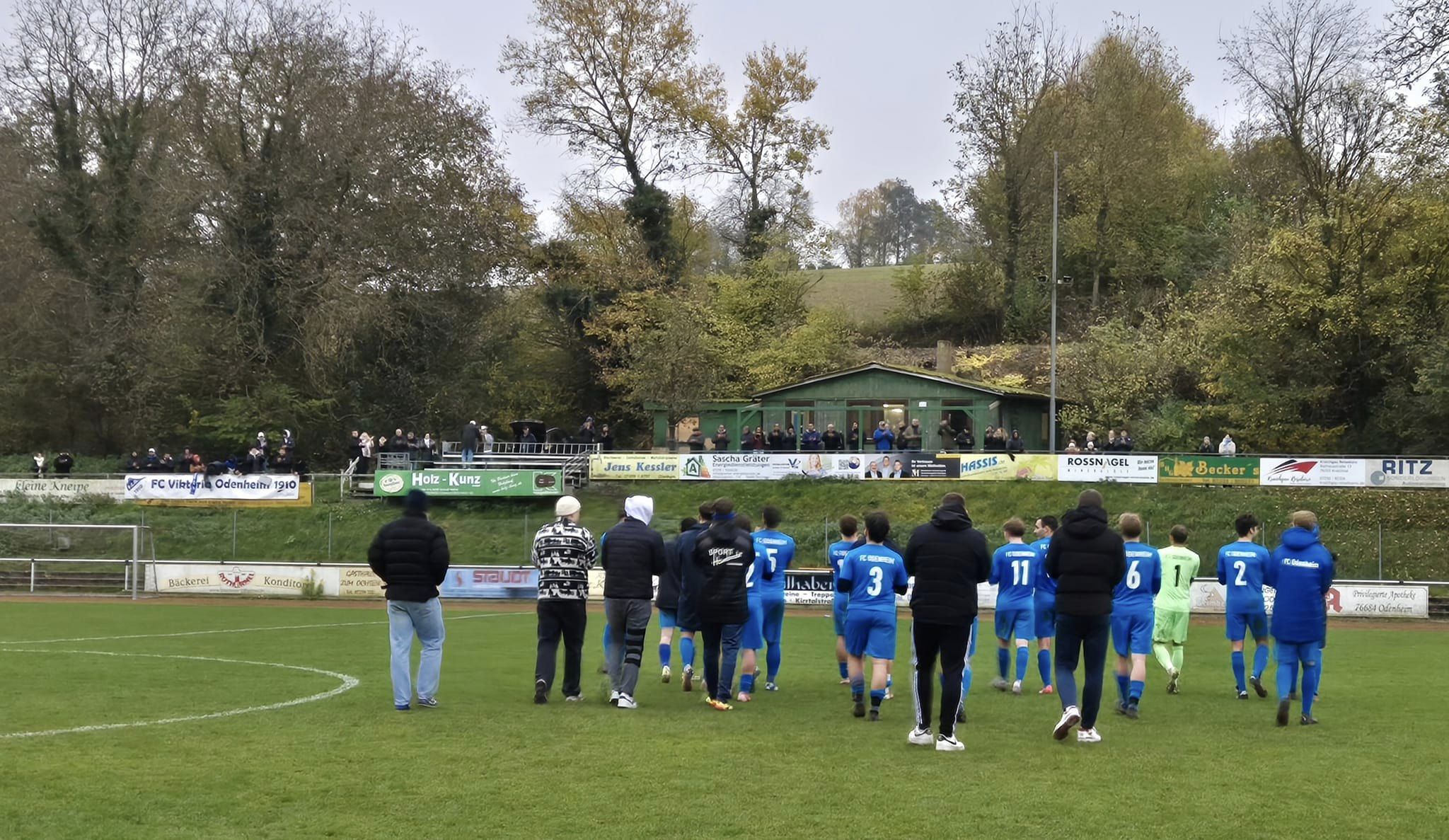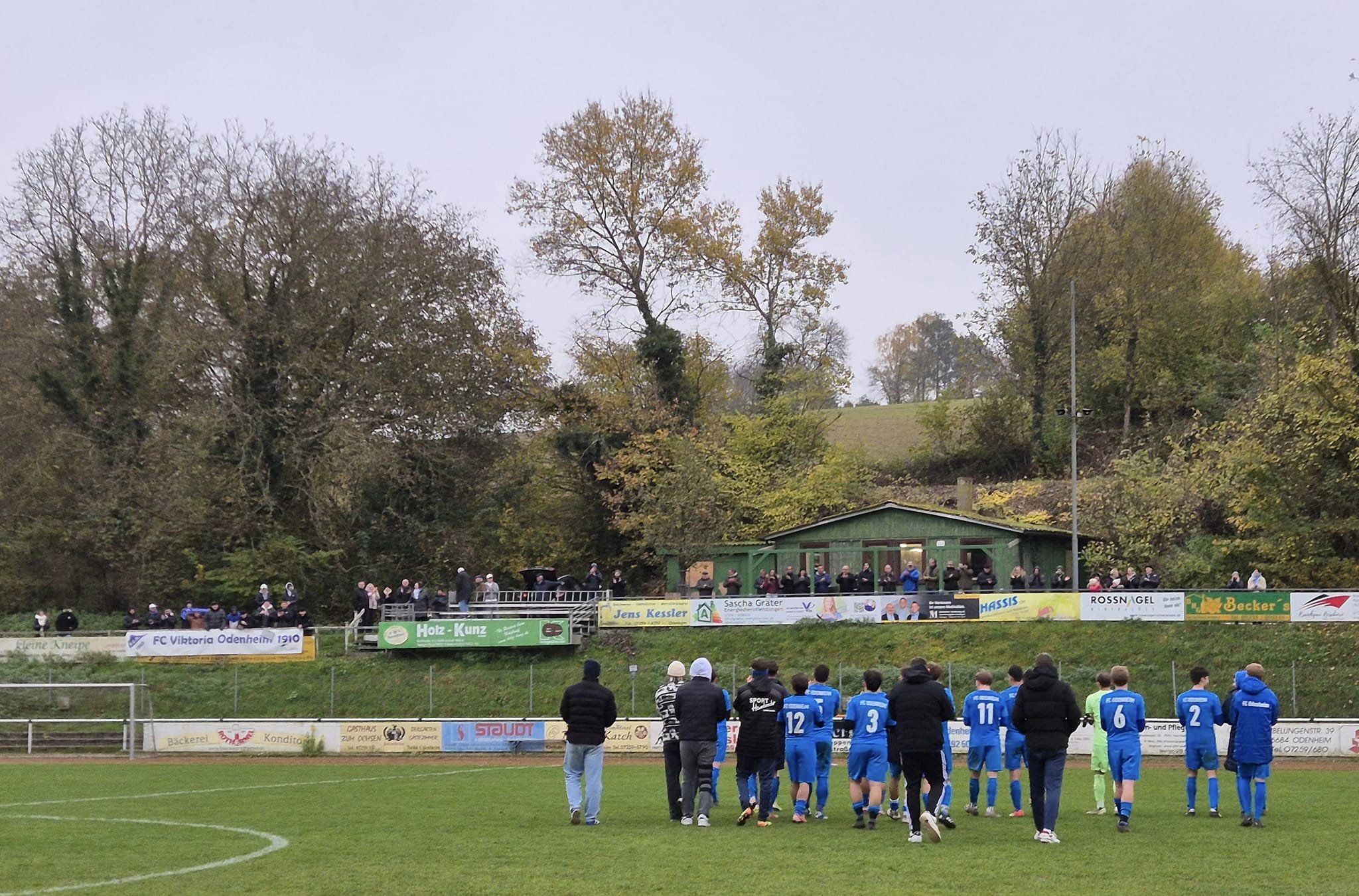 Unser FCO auch in Durchgang 2 mit der ersten Gelegenheit. Nach einem Freistoß von Knapp aus Rechtsaußenposition zeigte der FVU-Torhüter eine seiner seltenen Unsicherheiten. Ihm glitt der Ball aus den Händen und Goldschmidt wäre fast der Nutznießer gewesen. Der Schiri hatte aber eh ein Foul gesehen und entschied auf Freistoß für die Gastmannschaft. Diese kam in der 50. Minute zu ihrem ersten Abschluss überhaupt. Aus ca. 25 Metern ging der Ball aber ungefährlich ca. drei Meter über das FCO-Gehäuse. Auf der Gegenseite auch unser FCO mit einem Versuch aus der zweiten Reihe. Dieser durch Dominic Ferreira da Fonseca, zwar aufs Tor, aber auch eine sichere Beute des Torhüters (55.). In der 58sten probierte es Last aus 18 Metern, die vielbeinige FVU-Abwehr konnte aber abfälschen, sodass der Speed des Balles geringer wurde und der Torhüter diesen so ohne Probleme aufnehmen konnte. Unser FCO hatte zwar weiterhin ein klares Übergeweicht an Ballbesitz, kam aber im Gegensatz zu Abschnitt 1 nun nicht mehr zu klaren Gelegenheiten, es blieb weitestgehend bei Halbchancen. In der 61sten eine Freistoßmöglichkeit für Ubstadt, mehr als eine Ecke nach dem von der FCO-Mauer abgefälschten Ball, sprang aber für die Gäste dabei nicht heraus. Nach etwas einer Stunde lief unser junges Team Gefahr, sich nun in Einzelaktionen zu verheddern, man wurde teilweise hektisch. Wohl dem, der dann erfahrene Mannschaftskameraden wie Beer, Leist und Goldschmidt an seiner Seite hat, oder einen Coach Zabler an der Seitenlinie, die wieder zu mehr Ruhe am Ball anrieten. In diese Phase auch der erste Wechsel: Rico Schön da Silva für Last (63.). Nach knapp 70 Minuten wurde es wieder besser, unsere Elf ließ wieder mehr Geduld walten und wartete auf seine Chance. In der 71sten setzte Ferreira da Fonseca ein gutes Zeichen, als er den Ball noch vor der Toraußenlinie stark erlief. Leider wurde aber auch seine vielversprechende Hereingabe geklärt. Ein Kompliment gebührt auch der Abwehrzentrale der Gäste, in der der 42jährige frühere Stürmer Koch immer mehr zum Turm in der Schlacht avancierte. In der 71. Minute plötzlich mal die Gäste mit einem Abschluss aus 18 Metern, dem ersten und einzigen (!) überhaupt, der aufs FCO-Tor kam. Erstmals geprüft, bestand FCO-Keeper Christopher Kessler diese Probe schnell und sicher am Boden. Coach Zabler versuchte mit Ardian Krasniqi für den erkältungsbedingt etwas geschwächten Schneider für frischen Wind im FCO-Angriff zu sorgen (73.). Unsere Mannschaft weiter bemüht darum, Lösungen zu finden, die Gästeabwehr stand aber nach wie vor gut und machte es unseren Jungs nicht leicht. In der 79. Minute dann aber Schön da Silva mit keinem schlechten Versuch aus 25 Metern, ca. einen Meter zischte das Leder rechts am Tor vorbei. Kurz darauf prüfte Benz mit einem 22-Meter-Schuss den Torhüter. Neuer Elan kam auf. Dann die 81. Minute. Benz setzte sich über rechts durch und flankte scharf in Richtung Zentrum. Handspiel Ubstadt. Elfmeter! Beer ließ sich diese Chance nicht nehmen und verwandelte eiskalt zum umjubelten 1:0. In Summe ganz gewiss verdient, in der Entstehung aber durchaus etwas glücklich. Das Glück verdient sich aber eben auch nur der Tüchtige. Unser Team hat nie nachgelassen, schließlich die Ruhe und Geduld bewahrt und wurde nun belohnt. In der 84. Minute der zweite FCO-Wechsel: Sahin für Beer, der mit großem Applaus verabschiedet wurde. Und Sahin hätte fast gleich für das 2:0 gesorgt. Baumann behielt im Mittelfeld trotz Druck die Übersicht und passte auf rechts zu Sahin. Dieser mit seinem ersten Ballkontakt und an der Strafraumgrenze angekommen, mit der Finte, die ihm die Schussbahn eröffnete. Leider doch noch ein Bein dazwischen, sodass der Ball abgefälscht einen halben Meter übers Ubstädter Tor flog. Die Gäste hatten ihren Abwehrverbund inzwischen gelockert, auch Spielertrainer Wanitzek eingewechselt und versuchten nun, noch irgendwie zum Ausgleich zu kommen. Für unseren FCO galt, clever zu sein, defensiv gut zu stehen und mögliche Konter gut auszuspielen und möglichst zu verwerten. Dazu mithelfen sollte ab der 87. Minute auch Julian Fellhauer, der Baumann ersetzte. In der 89sten ein solch guter Konter über Krasniqi, Benz, nochmals Krasniqi und schließlich Sahin. Leider wurde auch dessen zweiter Abschluss geblockt. In der 90. Minute dann eine gute Freistoßsituation für Ubstadt, am rechten Strafraumeck. Spezialist Wanitzek schritt zur Tat und drehte den Ball mit Wucht auf Höhe des Fünfmeterraums. Aber etwas zu hoch angesetzt, sodass nicht wirklich gefährlich fürs FCO-Tor. Dann Staunen pur rundum im Siegfriedstadion: Hatte der Schiri tatsächlich 6 Minuten Nachspielzeit angezeigt? Hä? Warum? Erklären konnte man sich dies nicht wirklich, aber jammern galt nicht, vielmehr musste man sich weiterhin aufs Spiel konzentrieren. In der 90+1sten und 90+4ten zwei weitere gute bis sehr gute Kontermöglichkeiten unserer Viktorianer mit Großchancencharakter. Zunächst steckte Benz auf Krasniqi durch, der aber am gut aus seinem Tor kommenden FVU-Schlussmann scheiterte. Unmittelbar danach wurde auch einmal mehr ein Schuss von Sahin geblockt. Drei Minuten danach wieder Benz auf Krasniqi, der in Verlängerung des linken Fünfmeterraumecks aus ca. 10 Metern freistehend zum Abschluss kam, den Ball aber mit der Picke am rechten langen Toreck vorbeisetzte. In der 90+6. Spielminute wurde dann Geschichte geschrieben: Zum ersten Mal nach eigentlich März 2018 (klammern wir noch einen weiteren 14minütigen Einsatz im April 2023 aus), damals noch für den FC Östringen, betrat unser nun zurecht Spielertrainer genannter Coach das Fußballfeld und feierte damit sein FCO-Debüt als Spieler. Mit „Niklas Zabler“-Sprechchören wurde er begrüßt und brachte sich gleich mit einem gewonnen Kopfballduell ein. Der Schiri weitete seine schon zuvor sehr großzügig bemessene Nachspielzeit nun sogar auf fast 9 Minuten aus und kostete damit so manch treuen FCO-Fan scho
