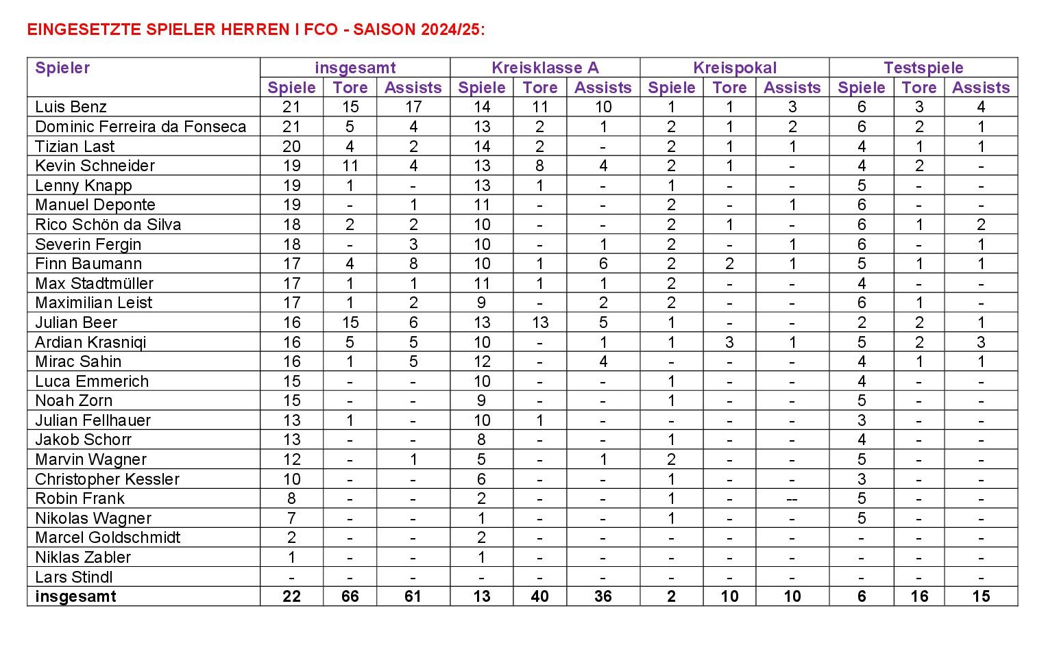Die meisten Torvorbereitungen in der A-Klasse (bei 36 von 40 Toren ausmachbar) gelangen Benz (10), Baumann (6), Beer (5), Sahin, Schneider (je 4), Leist (2), Severin Fergin, Ferreira da Fonseca, Krasniqi, Stadtmüller, Marvin Wagner (je 1). Inkl. Vorbereitung und Pokal unsere Vorlagengeber: Benz (17), Baumann (8), Beer (6), Krasniqi, Sahin (je 5), Ferreira da Fonseca, Schneider (je 4), Fergin (3), Last, Leist, Schön da Silva (je 2), Deponte, Stadtmüller, M. Wagner (je 1)