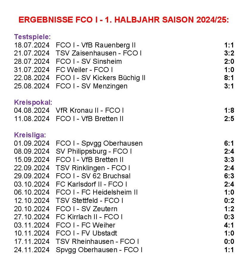 Den ersten Saisonteil (13 x Vorrunde plus ein Rückrundenspieltag) hat unser FCO als starker Tabellenzweiter punktgleich mit Herbst- und Wintermeister TSV Rheinhausen und mit einem Punkt Vorsprung gegenüber dem starken Aufsteiger VfB Bretten II beendet.