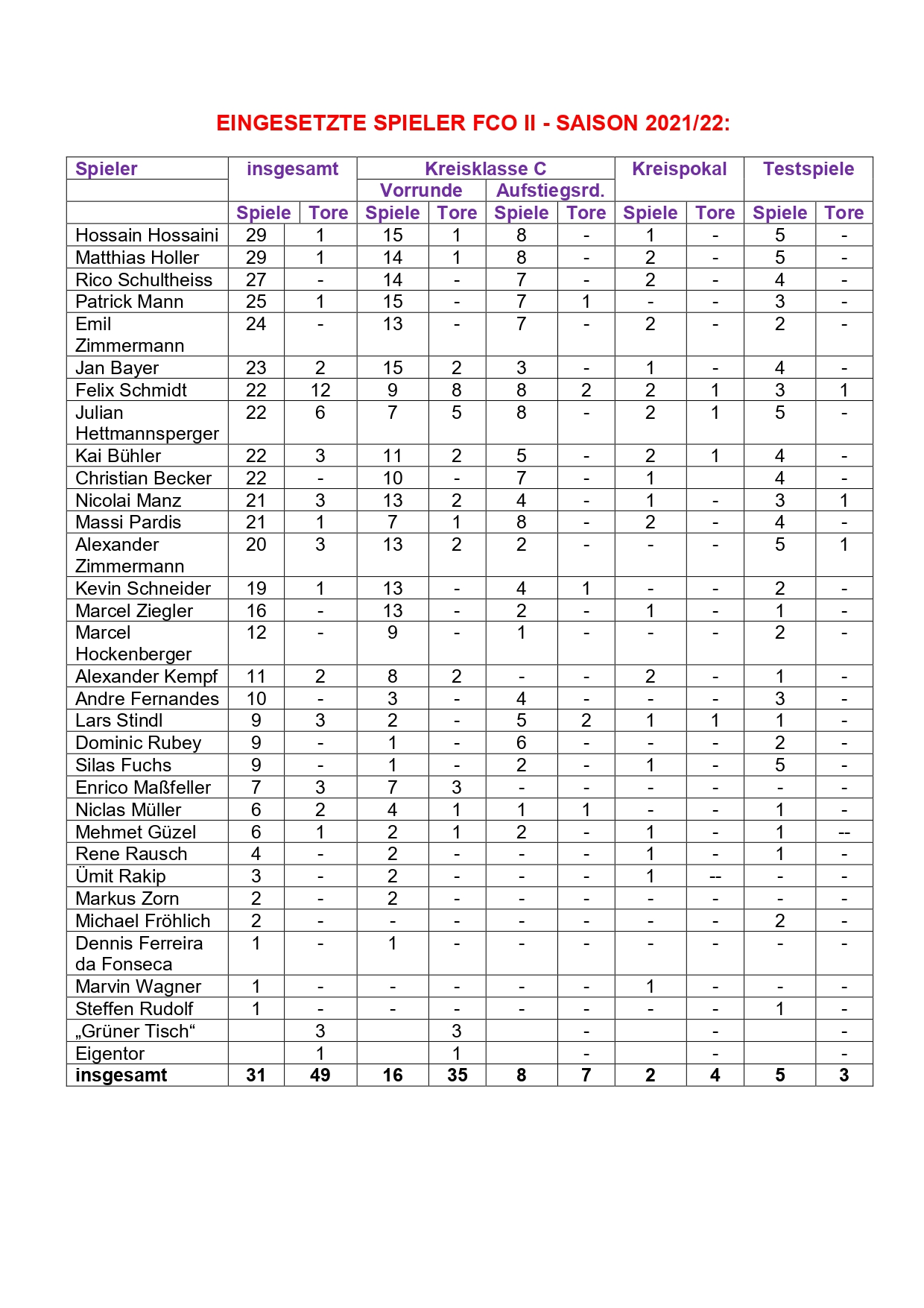 In Qualivor- und Aufstiegsrunde schnürten 28 Spieler ihre Kickschuhe für unseren FCO II. Bestwert von insgesamt 24 absolvierten C-Klassenspielen Hossain Hossaini (23) vor Matthias Holler, Patrick Mann (je 22), Rico Schultheiss (21) und Emil Zimmermann (20). Inkl. Pokal und Tests bestritt unser FCO II in dieser Saison 31 Spiele, in denen 31 Akteure zum Einsatz kamen. Die Bestwerte hier: Hossaini und Holler (je 29) vor Schultheiss (27). Siehe hierzu auch beigefügtes Foto „Eingesetzte Spieler“.
