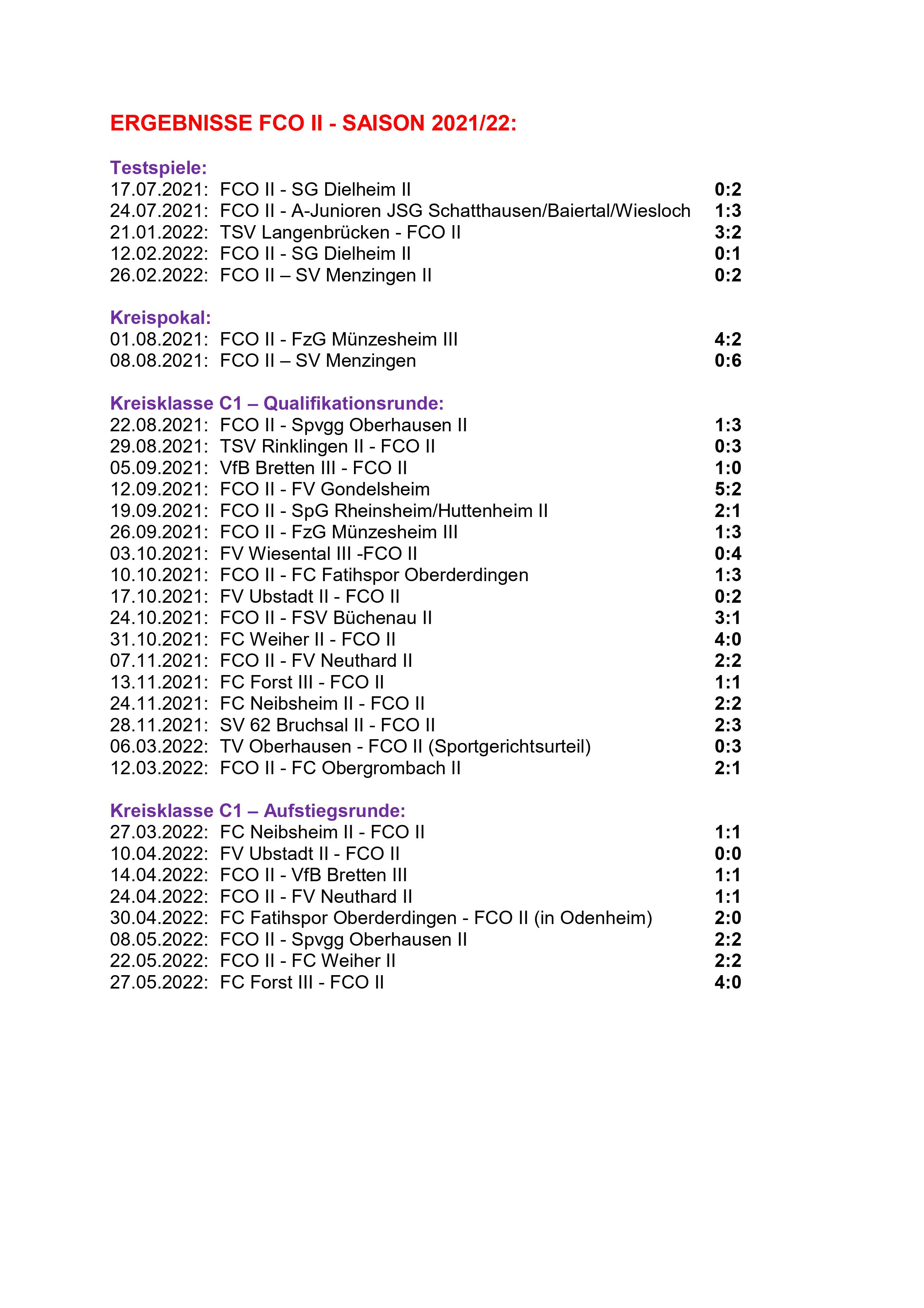In der nun folgenden Aufstiegsrunde wollte das Team jedoch mehr. In Spiel 1 beim FC Neibsheím führte man früh mit 1:0. Aufgrund Unvermögen im Torabschluss und einem überragenden gegnerischen Torhüter, kam man jedoch zu keinem weiteren Treffer und musste stattdessen den 1:1-Ausgleich hinnehmen. Kein Mensch hätte zu diesem Zeitpunkt daran gedacht, dass sich ausgerechnet Neibsheim später eines von drei Aufstiegstickets holen würde. Beim selbsternannten Aufstiegsanwärter FV Ubstadt II holte man anschließend ein 0:0-Remis. Zwar hatte auch Ubstadt Chancen besessen, unser FCO II jedoch die Besseren. Dennoch durfte man sich mit dem Spiel und Ergebnis zufrieden zeigen. Mit einer absoluten Energieleistung und nie aufgebend, erreichte unsere Mannschaft anschließend gegen den VfB Bretten III sehr spät in Minute 90+8, aber verdient, ein 1:1-Remis und damit das 3. Unentschieden im 3. Spiel der Aufstiegsrunde. Dieser Teilerfolg gegen den späteren Meister VfB Bretten III ist bemerkenswert, gelang es doch sonst nur noch dem späteren Zweiten FC Fatihspor, gegen Bretten einen Punkt zu holen. Gegen den FV Neuthard II erspielte sich die Mannschaft, wie bereits in den Wochen zuvor, wieder gute bis sehr gute Torchancen, konnte sich aber nur einmal belohnen. Der Gast glich die Führung unseres FCO II aus, somit am Ende ein 1:1. Damit das 4. Unentschieden im 4. Spiel – kaum zu glauben. Stark ersatzgeschwächt setzte es danach dann eine verdiente 0:2-Niederlage gegen den späteren souveränen Aufsteiger FC Fatihspor Oberderdingen. Die Personalsituation wurde leider nicht besser und dennoch wollte man gegen die Spvgg Oberhausen II nun unbedingt den ersten Sieg in der Aufstiegsrunde einfahren. Unsere Elf holte zweimal einen Rückstand auf und hätte am Ende sogar fast noch gewonnen. Das 2:2-Remis war aber als leistungsgerecht zu bezeichnen. Es war paradox, trotz bisher 5 Unentschieden und einer Niederlage, war zu diesem Zeitpunkt einer der Aufstiegsränge noch immer zumindest theoretisch möglich. Gleiches galt für den kommenden Gegner FC Weiher II, sodass sich gegen diesen eine Begegnung entwickelte, in der beide Kontrahenten Chancen zum Sieg hatten. Unser FCO II führte zur Pause mit 1:0, dann Weiher mit 2:1. Am Ende stand ein leistungsgerechtes 2:2-Remis, das sechste seiner Art im 7. Spiel. Und Weiher II sollte tatsächlich noch als drittes Team in die B-Klasse aufsteigen. Der abschließenden Begegnung beim FC Forst III kam damit keine wirkliche Bedeutung mehr zu. Unsere Mannschaft musste dort beim 0:4 ihre 2. Niederlage in der Aufstiegsrunde und höchste Saisonniederlage (wie auch noch beim 0:4 in der Vorrunde bei Weiher II) hinnehmen. Die Niederlage war unstrittig verdient, hätte aber zumindest nicht in dieser Klarheit ausfallen müssen, besaß man doch wieder einmal eine Fülle an teils allerbesten Chancen, um selbst Tore zu erzielen. Insofern war dieses Spiel nochmals ein Spiegelbild der gesamten Runde, die man unter dem Titel „Saison der verpassten Chancen“ zusammenfassen kann.
