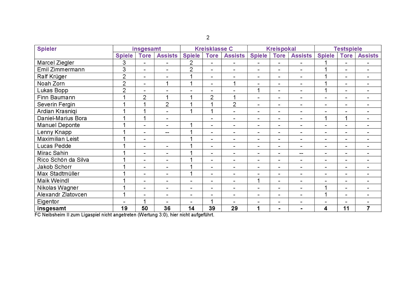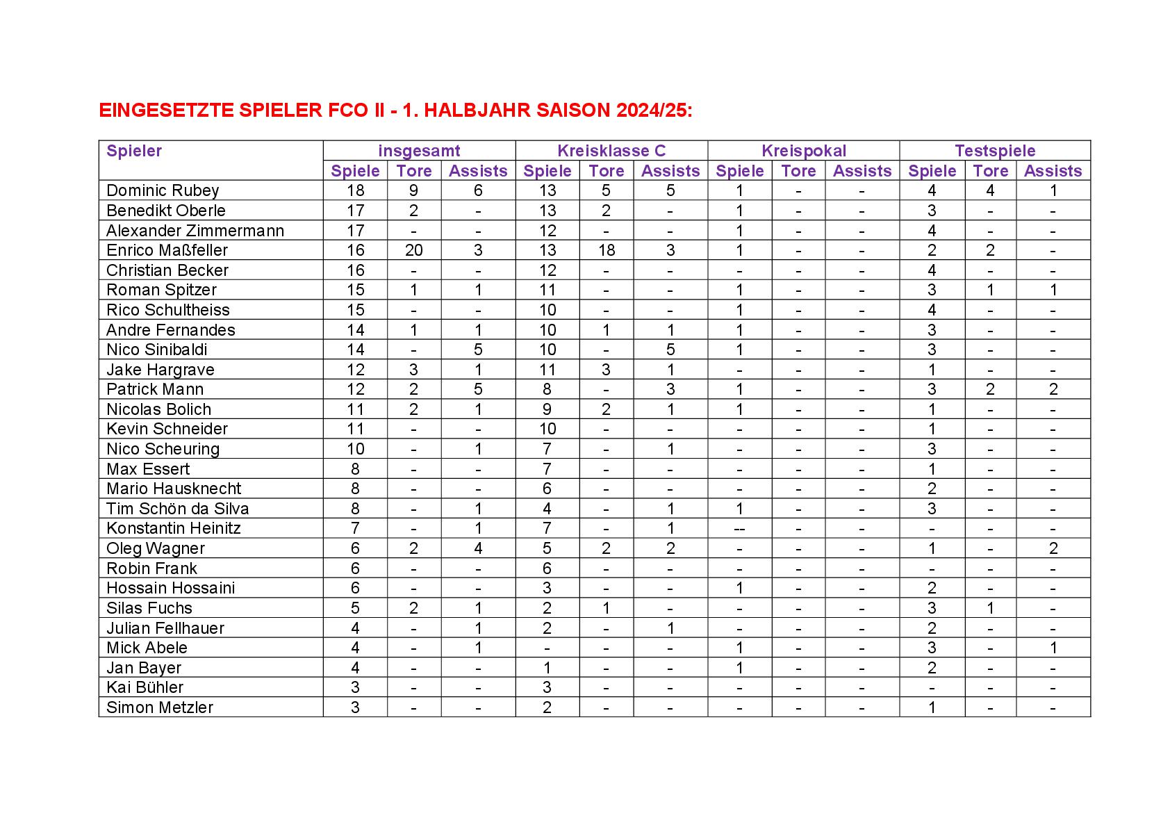 Konkret zu den Odenheimer Torschützen in der C-Klasse, insgesamt sind es 11 Mann, hinzu kam ein Eigentor eines Gegners (Obergrombach). Neben den beiden besten Schützen Maßfeller (18) und Dominic Rubey (5), trafen auch Jake Hargrave (3), Finn Baumann, Nicolas Bolich, Benedikt Oberle, Oleg Wagner (je 2), Severin Fergin, Andre Fernandes, Silas Fuchs und Ardian Krasniqi (je 1). Die gesamte bisherige Saison betrachtet (also inkl. Vorbereitung und Pokal), liest sich folgende Torschützenrangfolge bei insgesamt 50 Toren: Maßfeller (20), Rubey (9), Hargrave (3), Baumann, Bolich, Fuchs, Patrick Mann, Oberle, O. Wagner (je 2), Daniel-Marius Bora, Fergin, Fernandes, Krasniqi und Roman Spitzer (je 1).