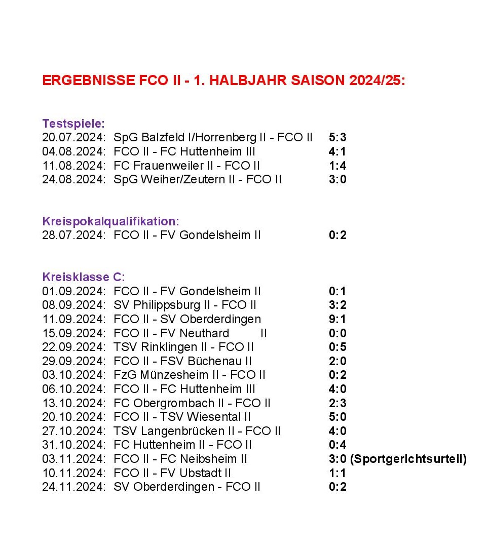 Zum Jahresabschluss erwartete unseren FCO II am 24.11. aber noch als 1. Rückrundenbegegnung das Spiel beim SV Oberderdingen, den man in der Vorrunde zuhause noch mit 9:1 besiegt hatte. Nach einer torlosen ersten Halbzeit legte unsere Zweite bei der einzigen Ersten Mannschaft im C-Klassenklassement in Durchgang 2 nochmals zu und fuhr am Ende einen sicheren 2:0-Erfolg ein, der das Team nach einer starken Halbserie auf dem 3. Tabellenplatz überwintern lässt.
