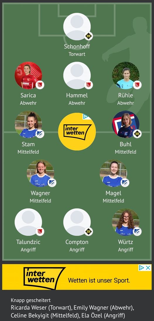 In die Elf der Woche für Spieltag Nr. 16 (3:2-Sieg bei SpG Heidelberg-Nord) wurden von unserem FCO Melina Stam, Jenny Wagner, Clarissa Magel und Milena Würtz berufen.
