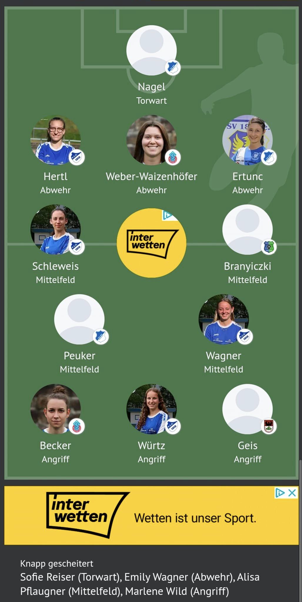 In die Elf der Woche für Spieltag Nr. 7 (1:0-Sieg gegen Bretten) wurden von unserem FCO Jacky Hertl, Steffi Schleweis, Jenny Wagner und Milena Würtz berufen. Zudem sind Sofie Reiser und Emily Wagner nur knapp am Einzug in die Elf der Woche gescheitert.
