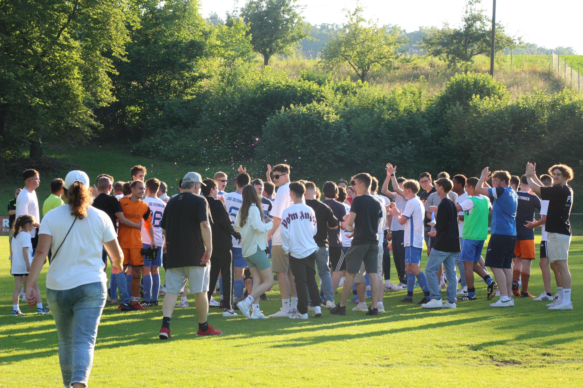 In der Halbzeit rückten die Jungs dann nochmals zusammen, um im zweiten Abschnitt zur Aufholjagd zu blasen. Mit vollem Tatendrang kam die Mannschaft aus der Kabine, um jedoch keine fünf Minuten nach Wiederanpfiff den nächsten Rückschlag hinnehmen zu müssen. Nach einem Konter des SV, der aus einem JSG-Standard resultierte, gab es Elfmeter für die Heimmannschaft, der zur 3:1 Führung verwandelt wurde. Aber auch der erneute Zwei-Tore-Rückstand konnte den Willen und Kampfgeist bei sommerlichen Temperaturen nicht brechen. Es dauerte wie schon im ersten Spielabschnitt keine drei Spielminuten, da konnten die Jungs auf 3:2 verkürzen. Nach einem weiten Ball von Linksverteidiger Süheyl S. war Stürmer Kevin S. durch und schloss im Sechzehner trocken zur seinem 7. Saisontreffer ab. Dieser Treffer entpuppte sich als Wirkungstreffer für unsere Mannschaft, der neue Kräfte freisetzte. Es ging nun rauf und runter auf dem Grün des Kickers-Stadion, auf dem mit zunehmender Spieldauer die Jungs der JSG immer mehr das Spiel an sich rissen. In der 70. Minute belohnten sie sich dann erneut und glichen zum 3:3 aus. Außenbahnspieler Luis B. konnte, nachdem er auf links freigespielt worden war, mit seinem stärkeren rechten Fuß vollenden. Luis B. war es dann erneut, der in der 84. Minute das Spiel endgültig drehte und alle Dämme brechen ließ. Mit seinem 10. Saisontreffer, der nach ähnlichem Strickmuster wie schon sein erster Treffer in diesem Spiel fiel, war der Aufstieg greifbar. Den berühmten Deckel auf das Spiel machte dann in der 88. Spielminute der eingewechselte Marius M. Nachdem er von Nicolas B. geschickt worden war, ließ er zunächst noch eine SV-Verteidiger aussteigen und schloss dann aus 16 Meter mit dem schwächeren linken Fuß zum 3:5 ab.