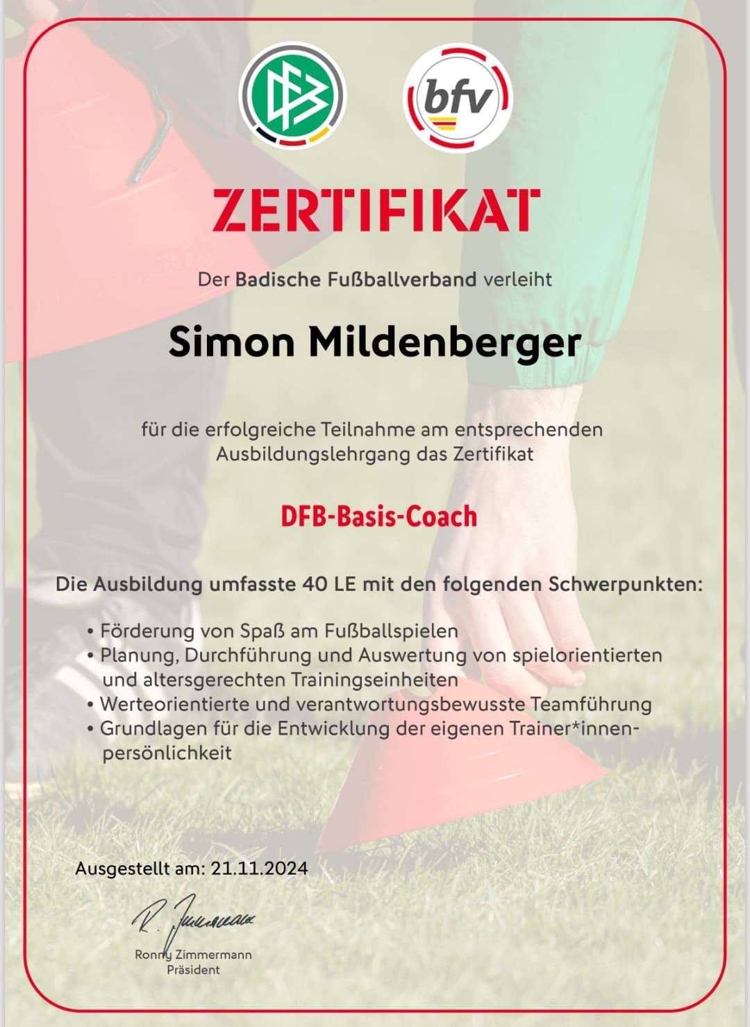 Nach dem erfolgreichen Abschluss aller Lehrgangsinhalte wurden Simon und seinen Lehrgangskollegen die Zertifikate mit unbegrenzter Gültigkeit verliehen. Dieses Zertifikat ist der erste Baustein in der Ausbildung zur C-Trainerlizenz, die Simon im kommenden Frühjahr angehen wird.