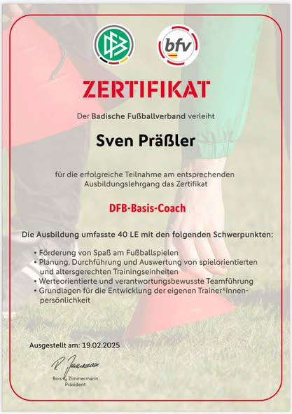 Unser Jugendtrainer Sven Präßler (aktuell E-Mädchen) hat in einer mehrwöchigen Fortbildungsmaßnahme mit 40 Lerneinheiten und einer dabei zwischenzeitlich auch dreitägigen Präsenzphase an der Sportschule Schöneck, das sogenannte DFB-Basis-Coach-Zertifikat erworben.