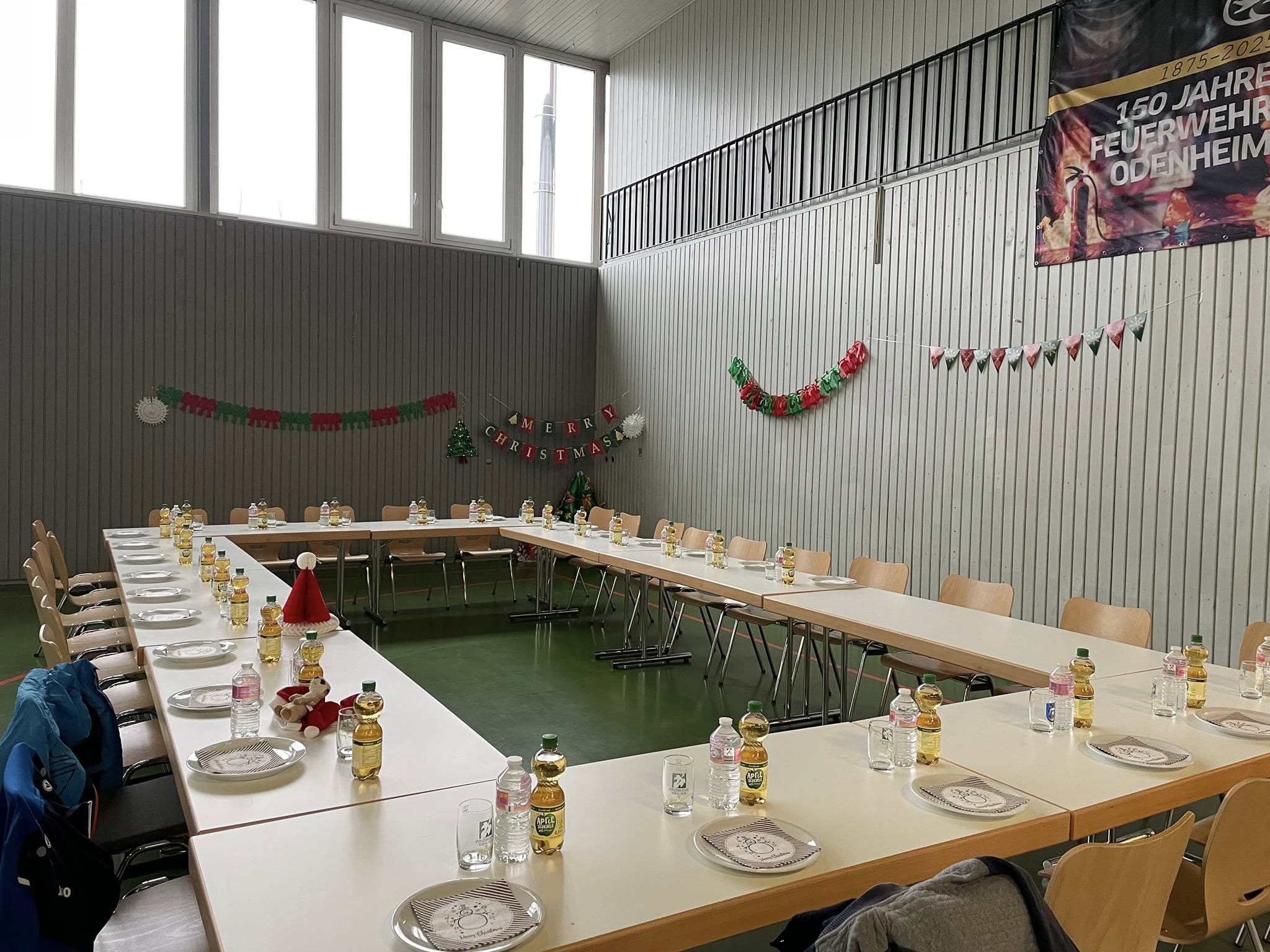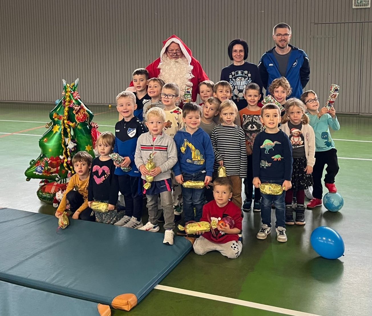 Die Kinder durften sich in der Mehrzweckhalle über verschiedene Attraktionen freuen, es gab eine große weihnachtliche Tischdecke zum Ausmalen, ein großes Tuch zum Bälle schleudern, natürlich Tore zum Kicken und zwei „leuchtende“ Fußbälle. Das Highlight war aber der Besuch des Weihnachtsmanns. Strahlende Kinderaugen blickten durch die Halle, die Überraschung war gelungen. Wir begrüßten den Weihnachtsmann mit unserem „Schlachtruf“ und danach sangen wir gemeinsam „Oh Tannenbaum“. Zur Stärkung gab es für alle Bambinis Pizza und als Nachtisch Muffins. Abgerundet wurde unsere Feier durch ein Spiel Bambinis gegen Trainer, welches mit einem fairen Unentschieden endete.