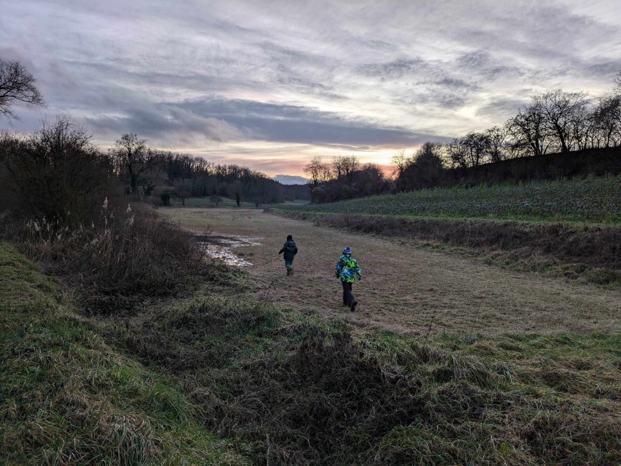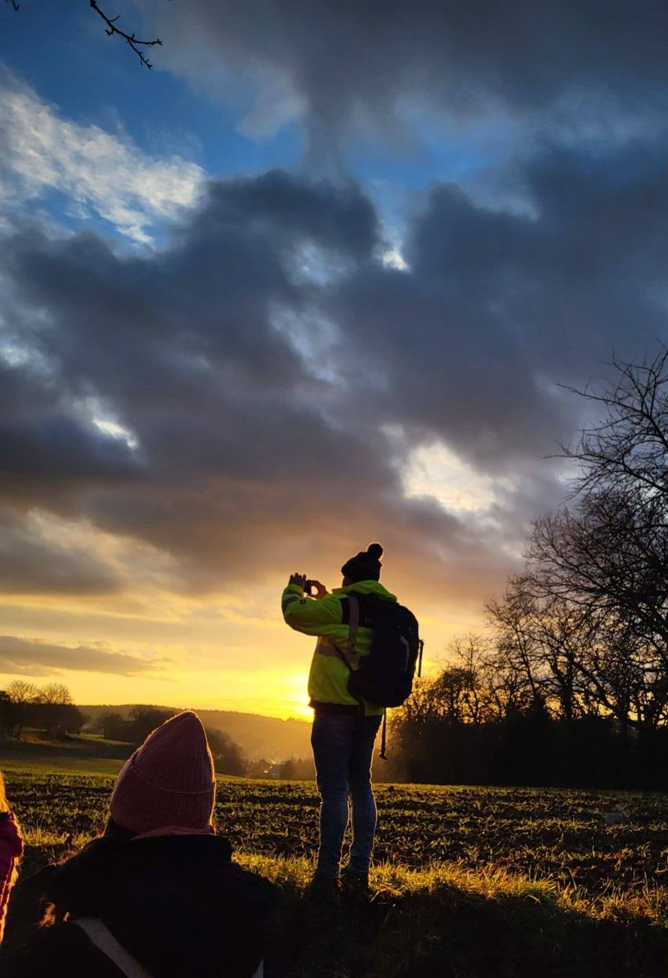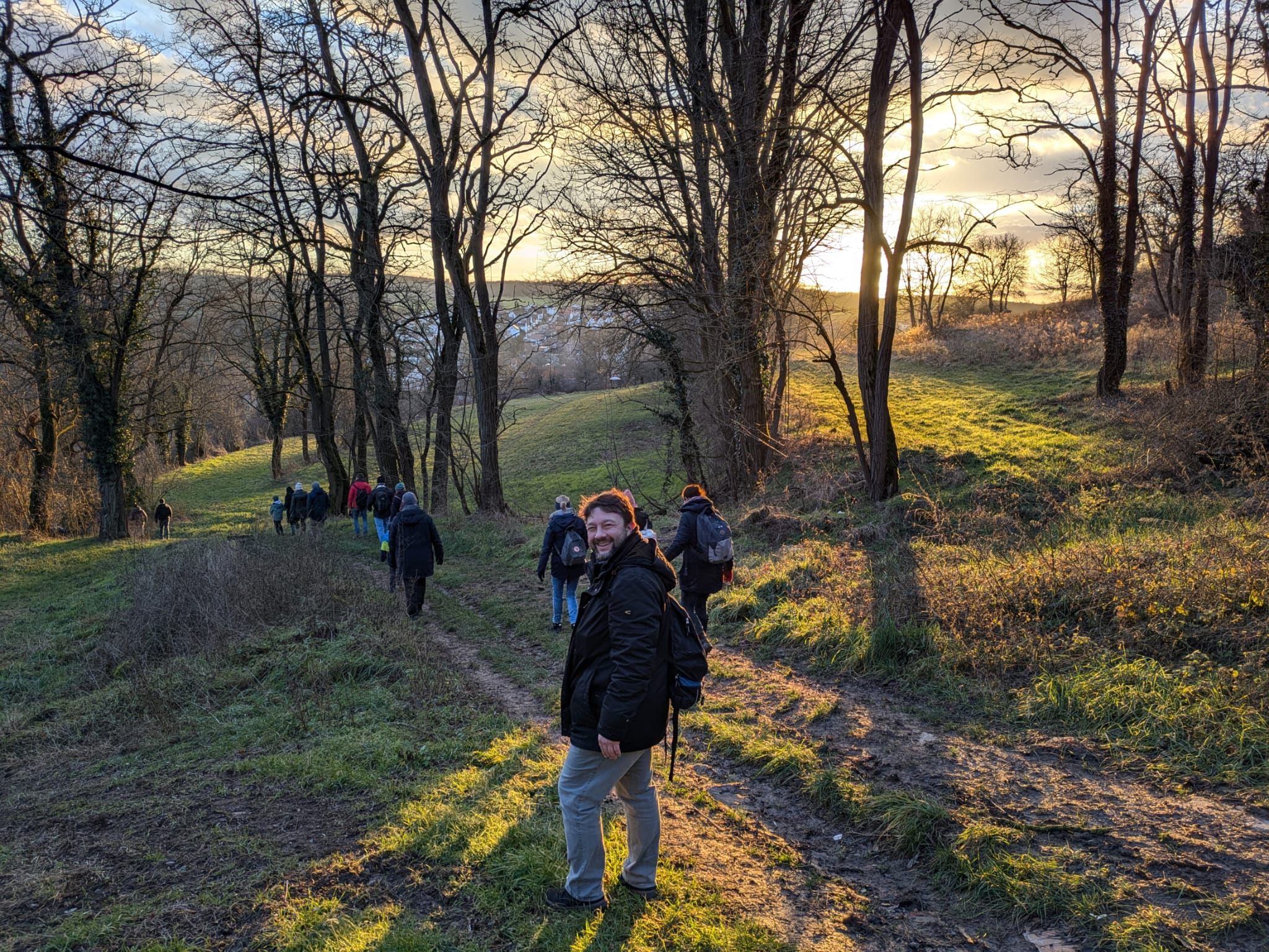 Der Treffpunkt war das Rathaus, von wo aus die Gruppe gemeinsam die Rathausstraße hinaufzog und über den Hohlweg zum Kappelberg wanderte. Hier konnten sie einen atemberaubenden Sonnenuntergang genießen, bevor es nach einem entspannten Abstieg zurück ins Dorf in Richtung Tiefenbach ging. An der Lourdeskapelle vorbei führte der Weg entlang der Kleewiesenhohle (Erle) zum Ziel: dem Grundstück der Familie Stricker.