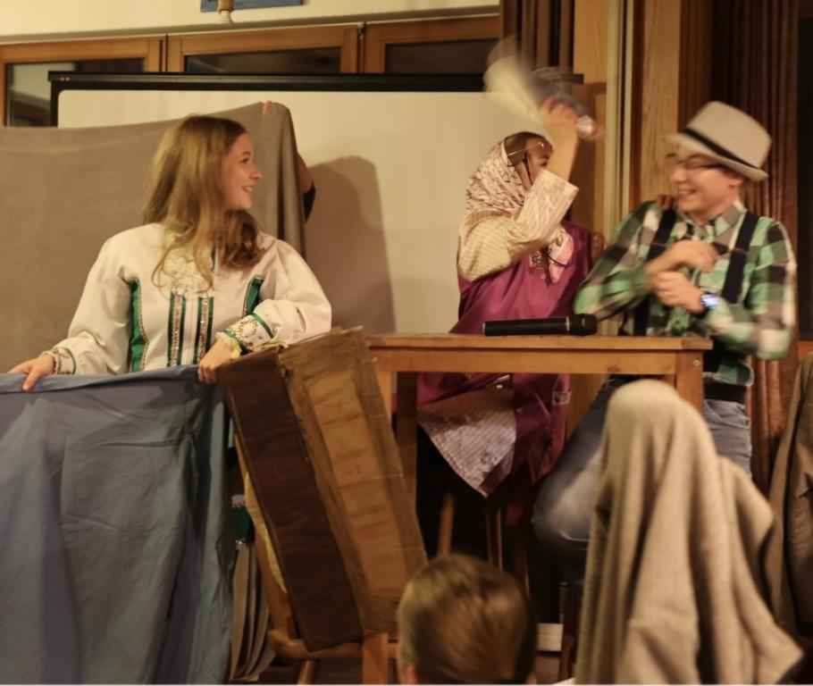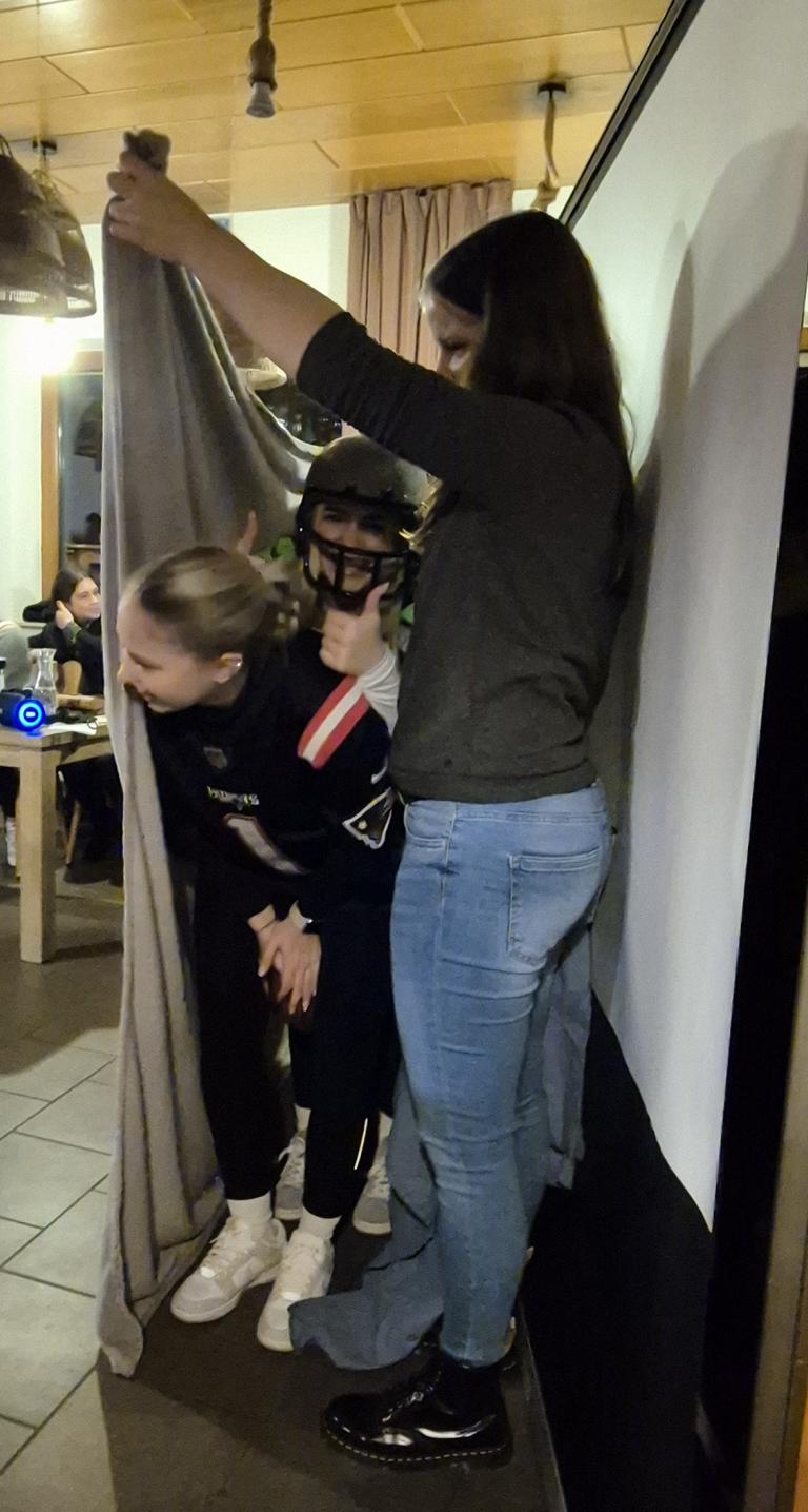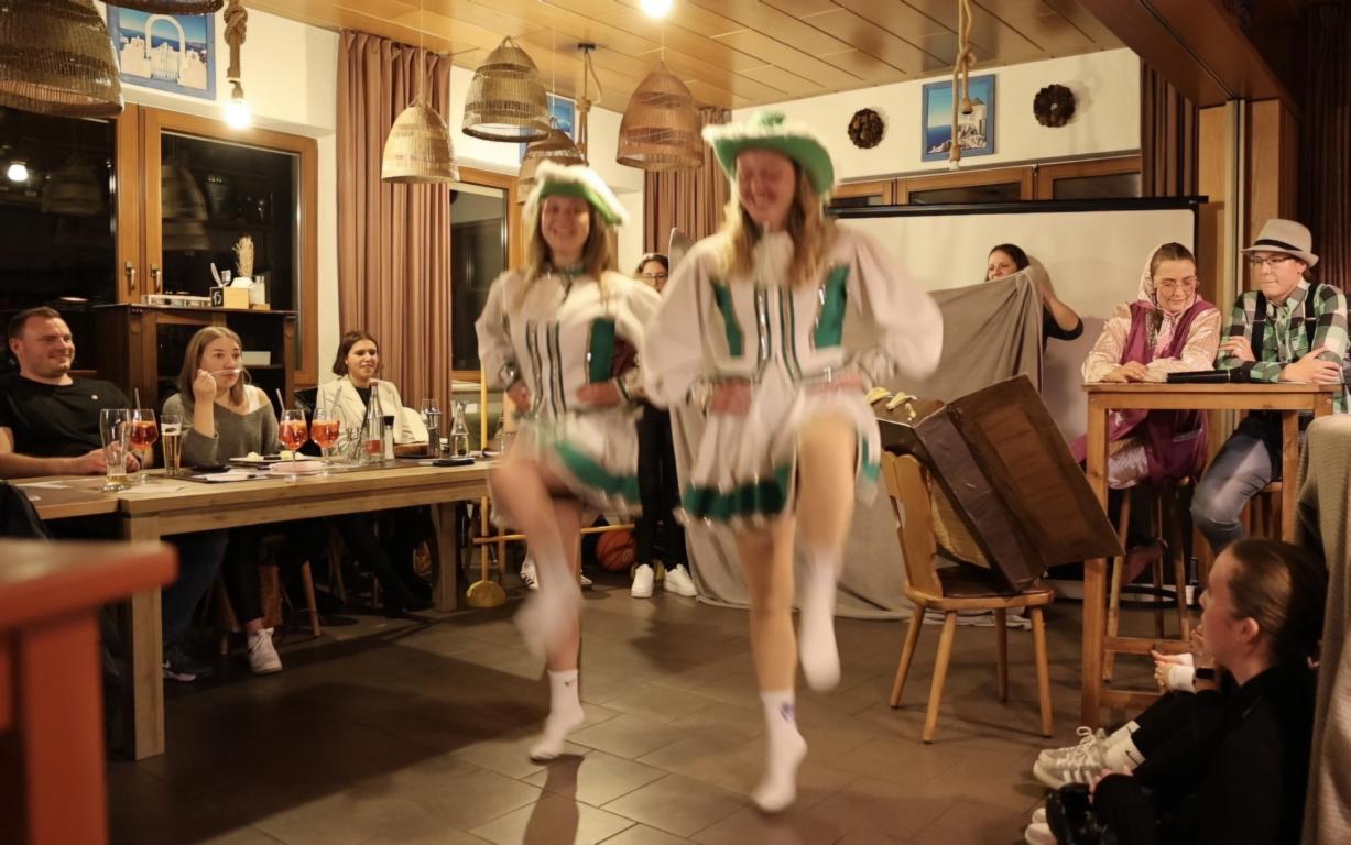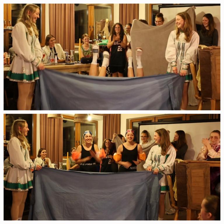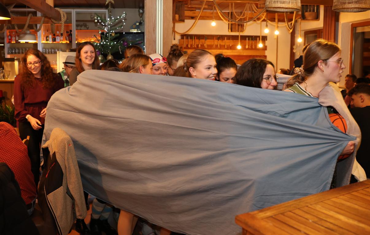 Es folgte der Beitrag unserer Damenmannschaft, die sich dafür wieder etwas ganz Besonderes hatte einfallen lassen. Anja und Simone schlüpften in die Verkleidung als vorwitzige/r Oma und Opa, die aus ihrer Stube durchs Fenster unsere FCO-Amazonen beobachten, die "scheener Maid, die letzte Saison so granatermäßig gut waren und ihren Verbandsligaaufstieg auf der Roll' von Andy May durch die Odna Straßen gefeiert haben." Jeweils lustig anmoderiert, zeigten unsere FCO-Damen ihr Können auch in anderen Sportarten wie American Football (Amelie und unser USA-Re-Import Sophia), Basketball (Annalena und Elena), Boxen (Amilia und Leonie; "Do gibt's noch mehr uff d'Fress als in der Verbandsliga!"), Gardetanz (Clarissa und Emily), Tennis (Jacky und Steffi), Synchronschwimmen (Jenny und Melina) sowie Reiten (Laura und Milena). Ihren tollen Vortrag beendeten unsere FCO-Amazonen tanzend im Kreis zum eigens für sie komponierten Song.