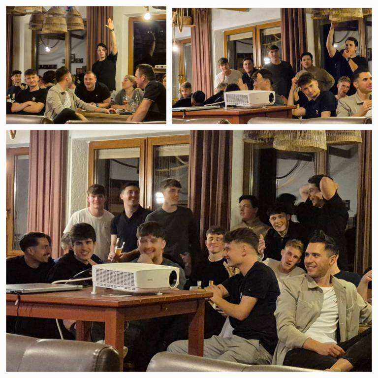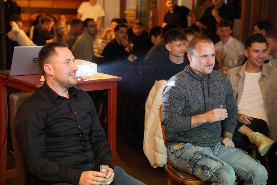 Nach einer kleinen Pause gab es Vortrag Nr. 3, den unserer Zwoden - und auch dieser war absolut gelungen. Benne Oberle und Roman Spitzer suchten nach "zwei Freiwilligen", um diese Suche sogleich mit "zwei freiwillige Trainer der 2. Mannschaft" zu konkretisieren. Das Trainerduo Jan Bayer/Mario Hausknecht war damit "verhaftet" und musste sich einem Trainerfrageduell stellen, in dem jede falsche Antwort mit einem Uso bestraft oder je nach Sichtweise belohnt wurde. Es waren die Anzahl von Spitznamen für Spieler, bestimmte Torschützen, der Gelbe-Karten-König und vieles mehr zu erraten. Sieger war das Publikum, das wie die vier Protagonisten viel Spaß hatte.