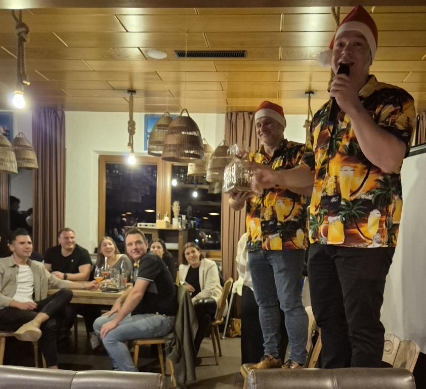 Was wäre unsere FCO-Weihnachtsfeier nur ohne Versteigerung und hier ohne unsere beiden Conférenciers Marco Witte und Thomas Vogel! Unter großem Applaus und in diesmal perfektem Outfit-Mix aus Nikolaus und Ballermann, betraten beide die "Manege" und versteigerten diverse Preise, die unserem FCO von Sponsoren zur Verfügung gestellt worden waren. 1.-Mannschaftscoach Niklas Zabler setzte gleich zu Beginn ein Zeichen, überbot sich selbst und angelte sich Preis #1. Tolle Objekte gingen an die FCO-Frau und an den FCO-Mann, seien es Bier-Caddys, Spirituosen, Tankstellengutscheine, Blumengutscheine u.v.m. Oft erklang ein langgezogenes Siebzichhhhhhh... durch den Saal (Insidergag) und einige Preise überstiegen auch die Hundertergrenze. Hauptpreise waren diesmal u.a. zwei VIP-Karten für die FCO-Apres-Ski-Party am 18. Januar (Onlineverkauf läuft, siehe auf www.fcodenheim.de) und als besondere Highlights zwei ganz tolle Unikate. Zum einen ein handsignierter Kalender mit coolen Fotos der Spieler unserer 1. Herrenmannschaft, die professionell vom Fotoatelier Uwe Zorn aufgenommen wurden und unsere "Jungen Wilden" mal ganz anders zeigen. Der Kalender ist in Kürze auch für jederfrau/-mann erhältlich (Infos folgen auf www.fcodenheim.de). Unter großem Jubel, gerade auch unserer Ersten, floss für das signierte Exemplar eine dreistellige Summe in die Kasse. Absolut einzigartig auch das final angebotene Versteigerungsobjekt. Unser Spielausschuss Nico Brien und sein Vater haben eine megatolle Stehtischtonne mit handbemaltem FCO-Wappen hergestellt, vielen Dank dafür! Diese sicherte sich unsere Vorstandschaft mit dem Höchstgebot, damit das tolle Werk seinen berechtigten Platz in der neu renovierten Grünen Hütte findet. Vielen Dank an Marco und Thomas, eure Versteigerung war wieder gespickt mit tollen Sprüchen und viel Humor und brachte eine schöne Summe in die Vereinskasse.