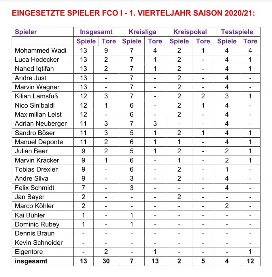 Unser FCO hat mit 13 die bis dato viertmeisten Treffer Ligaweit erzielen können. In der Liga bisher am Treffsichersten waren Mohammed R.S. Wadi mit 4 und Neuzugang Adrian Neuberger mit 3 Toren. Ligaübergreifend (also inkl. Pokal und Testspiele = 13 Spiele = insgesamt 30 FCO-Tore) konnte Wadi 9 Mal einnetzen. Hinter ihm folgen insoweit Neuberger, Sandro Böser und Kilian Lamsfuß mit je 3 Treffern. In Bezug auf alle absolvierten 13 Spiele konnten sich bisher zehn verschiedene Spieler in die Torschützenliste eintragen (zusätzlich Beer, Deponte, Hodecker und Nahed J.Y. Iqtifan je 2 sowie Marvin Kracker und Nico Sinibaldi je 1; hinzukommen zwei Eigentore der Gegner). In der Kreisliga zeigten sich bisher die beiden Stettfelder Leibold und Türedi (je 6 Treffer) am Erfolgreichsten, gefolgt von vier Torjägern mit je 4 Treffern, darunter unserem Wadi.