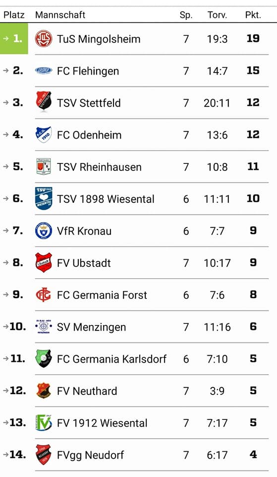 Noch ein Blick auf das bisherige Kreisligaklassement: Der TuS Mingolsheim konnte seine ersten 6 Spiele allesamt gewinnen und musste erst zuletzt am 7. Spieltag gegen den TSV Stettfeld (2:2) erstmals Punkte einbüßen. Als einzige Kreisligamannschaft ist man bisher noch ungeschlagen, je eine Niederlage weisen Stettfeld, Kronau und unser FCO auf. Mingolsheim stellt die zweitbeste Offensive (19 Tore) und beste Defensive (3 Tore) und führt die Tabelle mit 19 Punkten und 4 Zählern Vorsprung vor dem FC Flehingen an, der bisher alle seine vier Heimspiele gewinnen konnte und auf insgesamt 5 S, 2 N, 15 Punkte und 14:7 Tore kommt. Mingolsheim, Flehingen und natürlich Stettfeld wurden vor Saisonbeginn am Häufigsten als Titel- und Aufstiegsfavoriten genannt und liegen demnach nicht unerwartet auf den ersten drei Rängen, sprich Stettfeld auf Position 3 (3 S, 3 U, 1 N, 12 Punkte und 20:11 Tore; die meisten erzielten Tore). Punktgleich hinter den Stettfeldern rangiert erfreulicherweise bereits unser FCO, gefolgt vom TSV Rheinhausen (11 Punkte, 10:8 Tore), vom TSV Wiesental (10 Punkte, 11:11 Tore bei einem Spiel weniger), vom VfR Kronau (9 Punkte, 7:7 Tore bei einem Spiel weniger), vom FV Ubstadt (9 Punkte, 10:17 Tore, zusammen mit 2 weiteren Teams die meisten Gegentore) und vom FC Germania Forst (8 Punkte, 7:6 Tore bei einem Spiel weniger). Einen kleinen Bruch in der Tabelle gibt es zu Rang 10, den der SV Menzingen nach zuletzt 3 Niederlagen mit 6 Punkten und 11:16 Toren einnimmt. Dahinter ein Trio mit je 5 Punkten (FC Germania Karlsdorf 7:10 Tore, FV Neuthard 3:9 Tore, FV Wiesental 7:17 Tore). Die Rote Laterne nimmt derzeit die FVgg Neudorf ein (4 Punkte, 6:17 Tore).