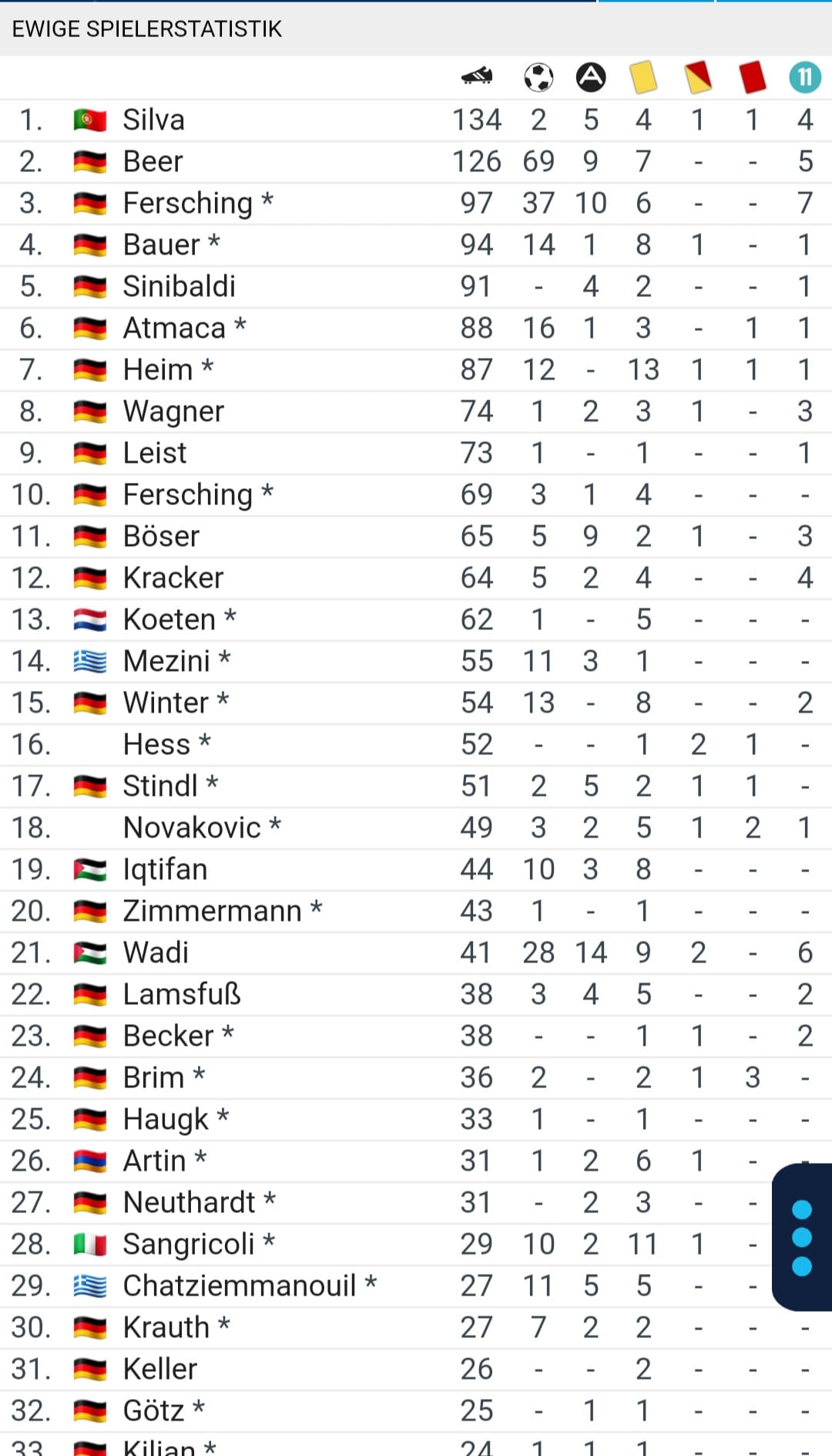 Auf Rang 8 geführt wird Marvin Wagner (24 Jahre) mit 74 Kreisligaspielen. Er könnte in der kommenden Spielzeit die vor ihm liegenden Dennis Atmaca (88 Spiele) und Tobias Heim (87 Spiele) überholen.