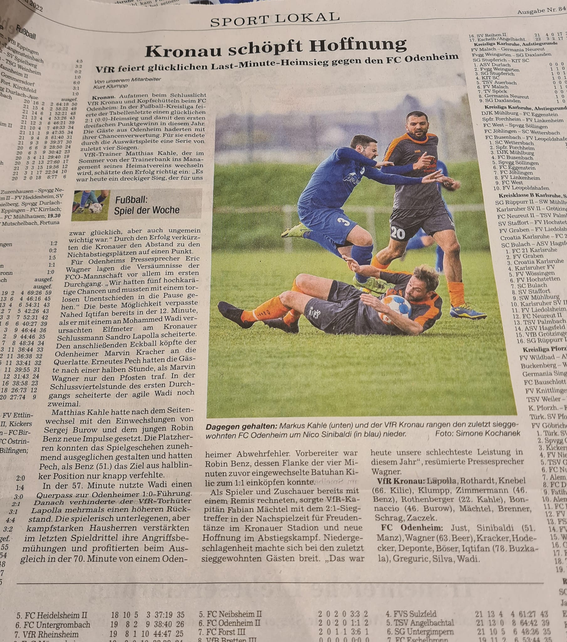 Die Euphorie des Siegers fand bei einem Heimakteur seine Entladung in Form einer obszönen Geste gegenüber den Odenheimer Zuschauern. Während wir dem jungen Kronauer Nachhilfeunterricht in Sachen Kinderstube wünschen, gratulieren wir dem VfR insgesamt zu dessen Willensleistung und einem zwar sehr glücklichen, aber vom Verlauf her am Ende noch nicht einmal gänzlich unverdienten Sieg. Sportsmännern wie dem Sportlichen Leider des VfR, Mark Geckler, ist dieser nach der bisherigen Kronauer Seuchensaison zu gönnen, auch wenn das insoweite Geschenk natürlich nicht gerade von unserem FCO hätte kommen müssen.