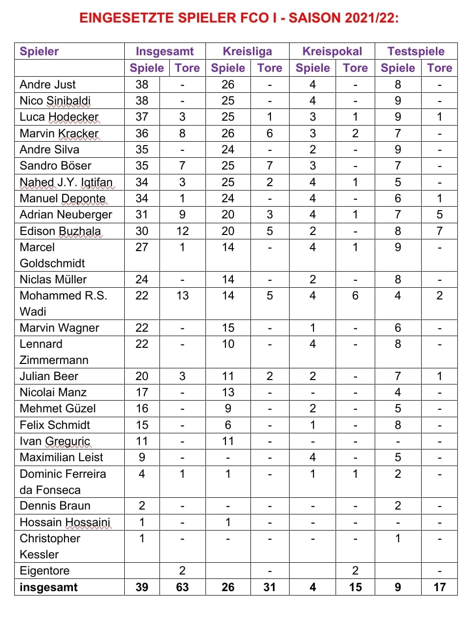In der diesjährigen Kreisligasaison schnürten 22 Spieler ihre Kickschuhe für unseren FCO. Alle 26 Kreisligaspiele bestritten nur Just und Kracker. Nur jeweils eines verpassten Böser, Hodecker, Sinibaldi und Iqtifan, nur deren zwei Kapitän Andre Silva und Deponte. Buzhala und Neuberger kamen auf immerhin 20 KL-Einsätze. Der erst unserer eigenen Jugend entsprungene Niclas Müller spielte in seiner 1. Seniorensaison immerhin 14 mal in der Kreisliga. Aufgrund langwieriger Verletzungen konnten 5 Spieler eigentlich nur eine Halbserie spielen und bestritten damit in dieser Kreisligasaison „nur“ folgende Spiele: Wagner (15), Goldschmidt, Wadi (je 14), Beer (11) und Lennard Zimmermann (10). Auf zweistellige Einsatzzahlen kamen nur noch Nicolai Manz (13), der zum Ende der Vorrunde von der 2. Mannschaft aufgerückt war, sowie Winterneuzugang Ivan Greguric (11). Inkl. Pokal und Tests bestritt unser FCO in dieser Saison 39 Spiele, in denen 25 Akteure zum Einsatz kamen. Die Bestwerte hier: Just, Sinibaldi (je 38, also jeweils nur ein Spiel verpasst), Hodecker (37), Kracker (36), Silva und Böser (je 35), Deponte und Iqtifan (je 34). Die 30er-Grenze überschritten auch noch Neuberger (31) und Buzhala (30). Siehe hierzu auch beigefügtes Foto „Eingesetzte Spieler“.