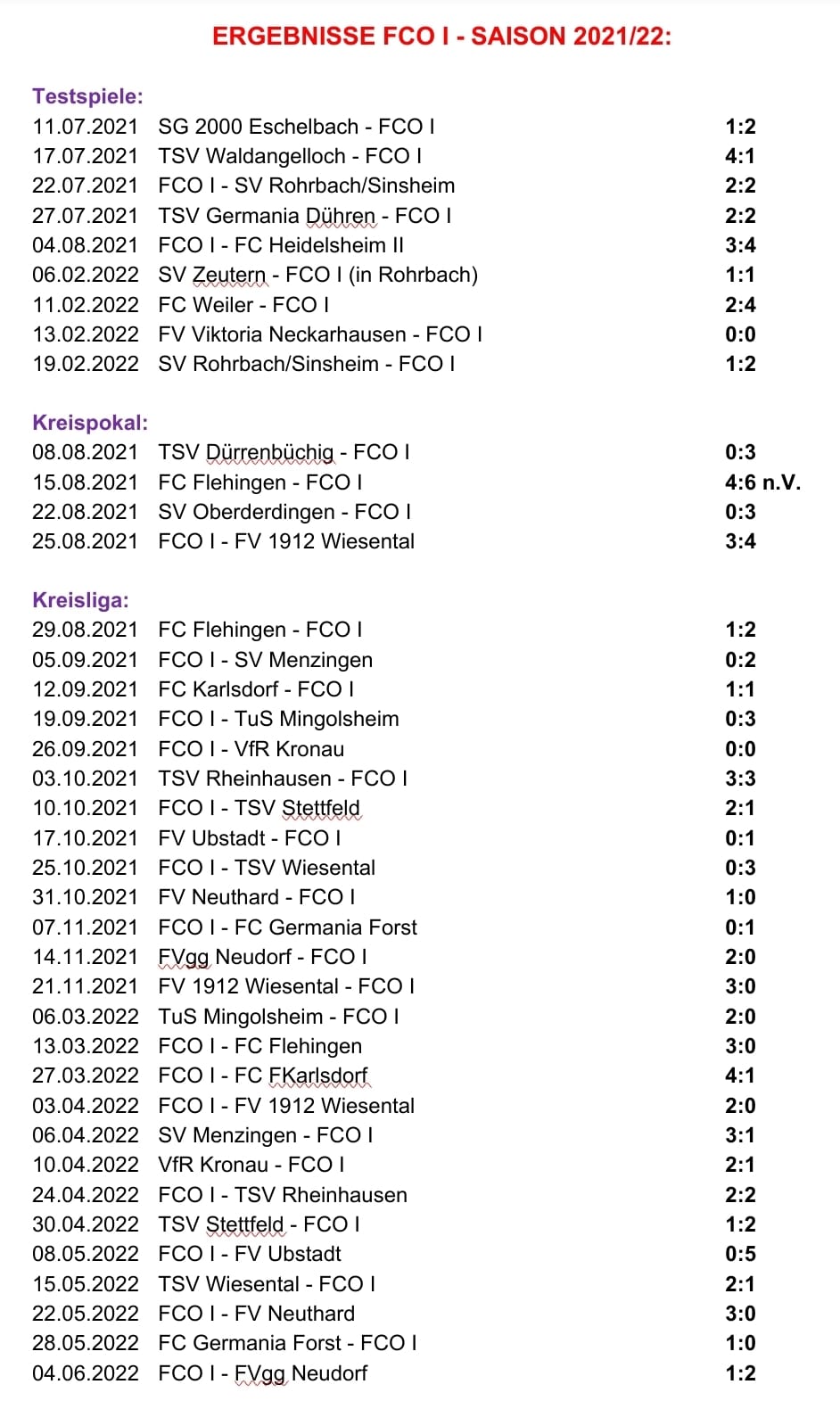 Unser FCO schloss zum Ende der Saison 2021/22 seine 19te Kreisligaspielzeit in Folge mit 9 Siegen und 4 Unentschieden bei 13 Niederlagen ab. Mit 31 Punkten und 31:40 Toren nimmt man Tabellenplatz 9 ein (siehe hierzu auch den kürzlich veröffentlichten Rückblick Kreisliga 2021/22 unter Rückblick Kreisliga 2021/22).