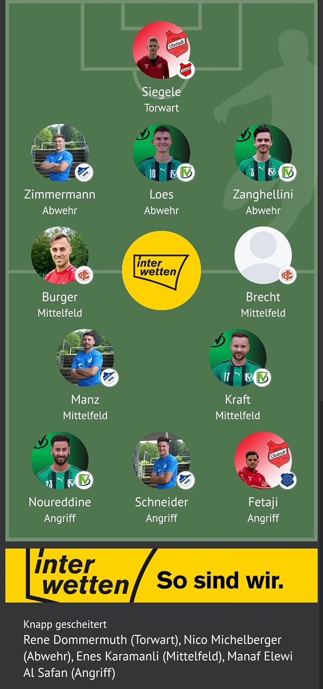 In die Elf der Woche für Spieltag Nr. 17 (1:0-Sieg gegen TSV Wiesental) wurden von unserem FCO Nicolai Manz (24 Stimmen), Lennard Zimmermann (13) und Kevin Schneider (12) berufen. Zudem ist Manaf Safan (15) nur knapp am Einzug in die Elf der Woche gescheitert. Weitere Spieler unseres FCO kamen auf eine zweistellige Stimmenanzahl: Sandro Böser (23), Marvin Wagner (18) und Luca Hodecker (mind. 12, aktuell leider Anzeigefehler FuPa).