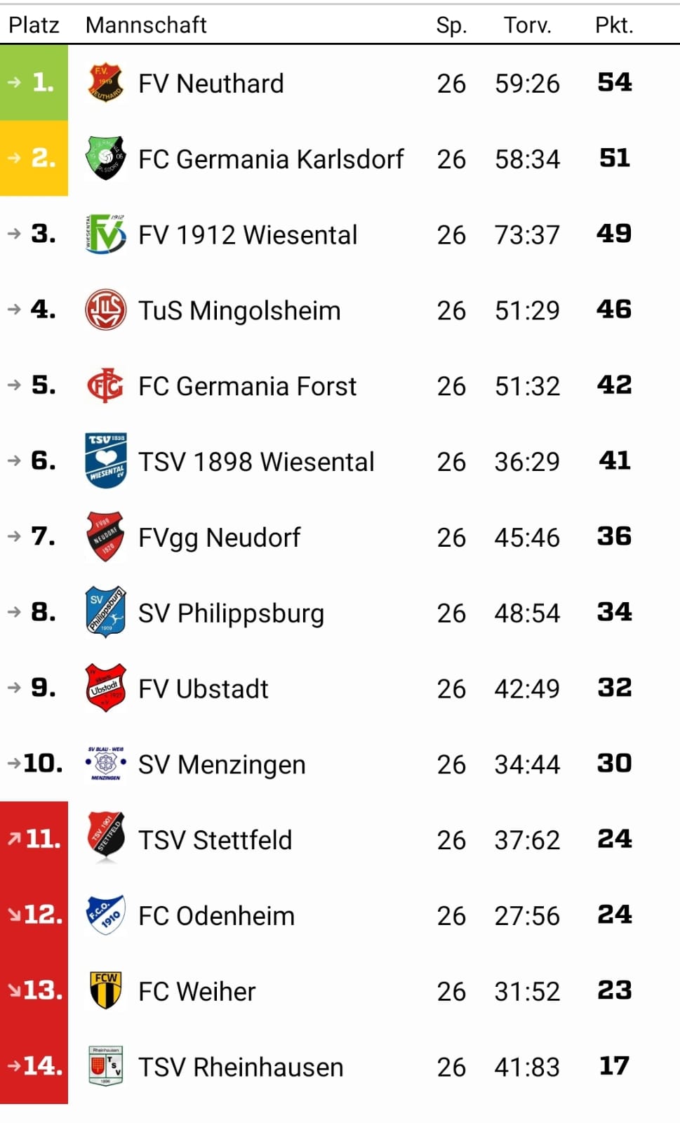 4 von 14 Vereinen müssen absteigen – schon krass und dem geschuldet, dass aus der Landesliga gleich drei Bruchsaler Vereine in die Kreisliga abgestiegen sind (Flehingen, Büchig, Hambrücken) und eben Karlsdorf als Kreisligazweiter den Relegationssieg nur knapp verpasst hat.