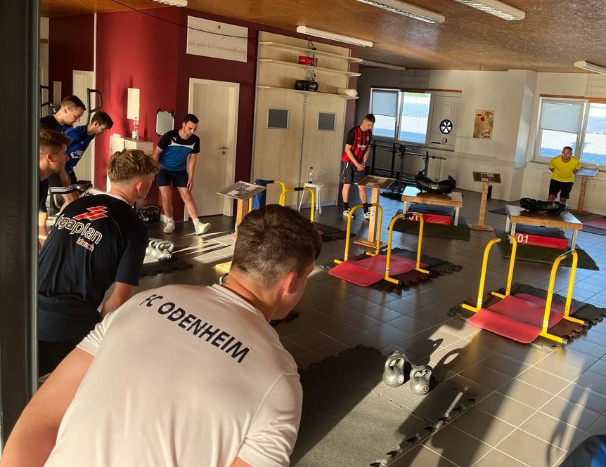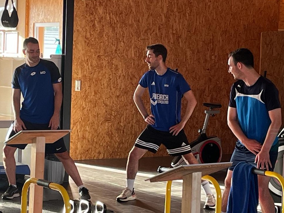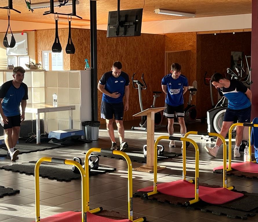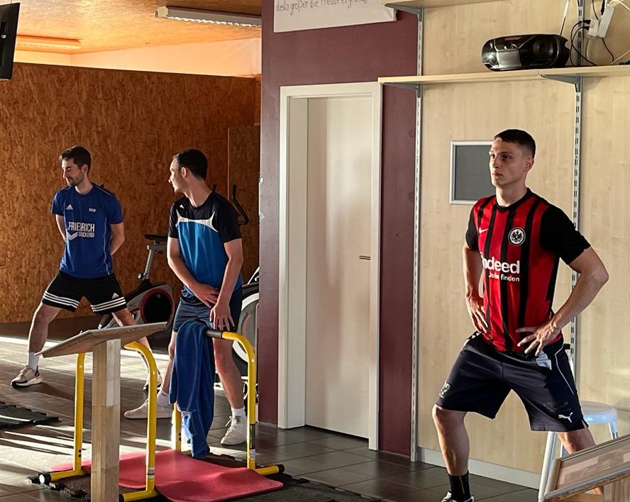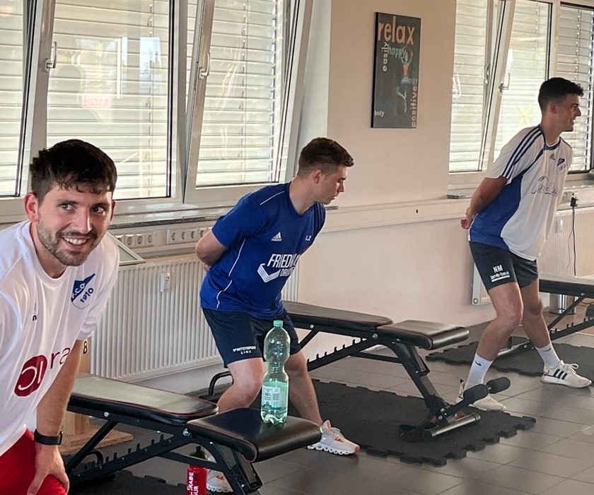 Für unsere 1. Herrenmannschaft ging es am Freitag, den 14. Juli, bei der 4. Trainingseinheit der diesjährigen Sommervorbereitung mal nicht auf den Platz, sondern nach Weiher ins dortige Studio „Free Moves – Beweg dich fit!“, das mit Sascha Just (Fitnesstrainer, Fachtrainer für Rehabilitation) und Steffen Just (Staatlich anerkannter Sport- und Gymnastiklehrer, Sporttherapeut, Bachelor of Fitnessökonomie, Fachtrainer für Rehabilitation, Rückenschulleiter) von zwei ehemaligen Fußballschützlingen unseres Trainers Alex Runne und bis zur vergangenen Saison Spielern des FC Weiher geleitet wird. Unseren Männern wurde ein abwechslungsreiches funktionelles Training zur weiteren Fitnessverbesserung angeboten und trotz mehreren Tropen Schweiß waren alle mit viel Spaß und großer Motivation bei der Sache. Vielen Dank an Sascha und Steffen! Fotos siehe nachstehend.