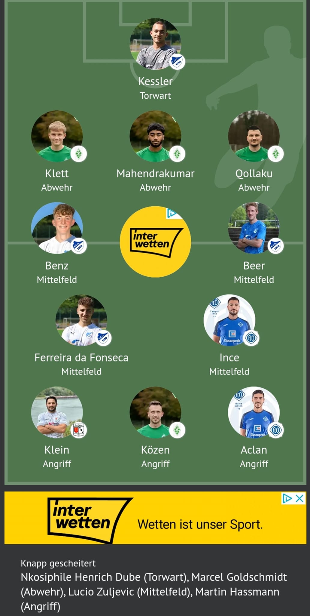 In die Elf der Woche für Spieltag Nr. 25 (6:1-Sieg gegen Weiher) wurden von unserem FCO nun Christopher Kessler, Luis Benz, Julian Beer und Dominic Ferreira da Fonseca berufen. Zudem ist Marcel "Goldi" Goldschmidt nur knapp am Einzug in die Elf der Woche gescheitert.