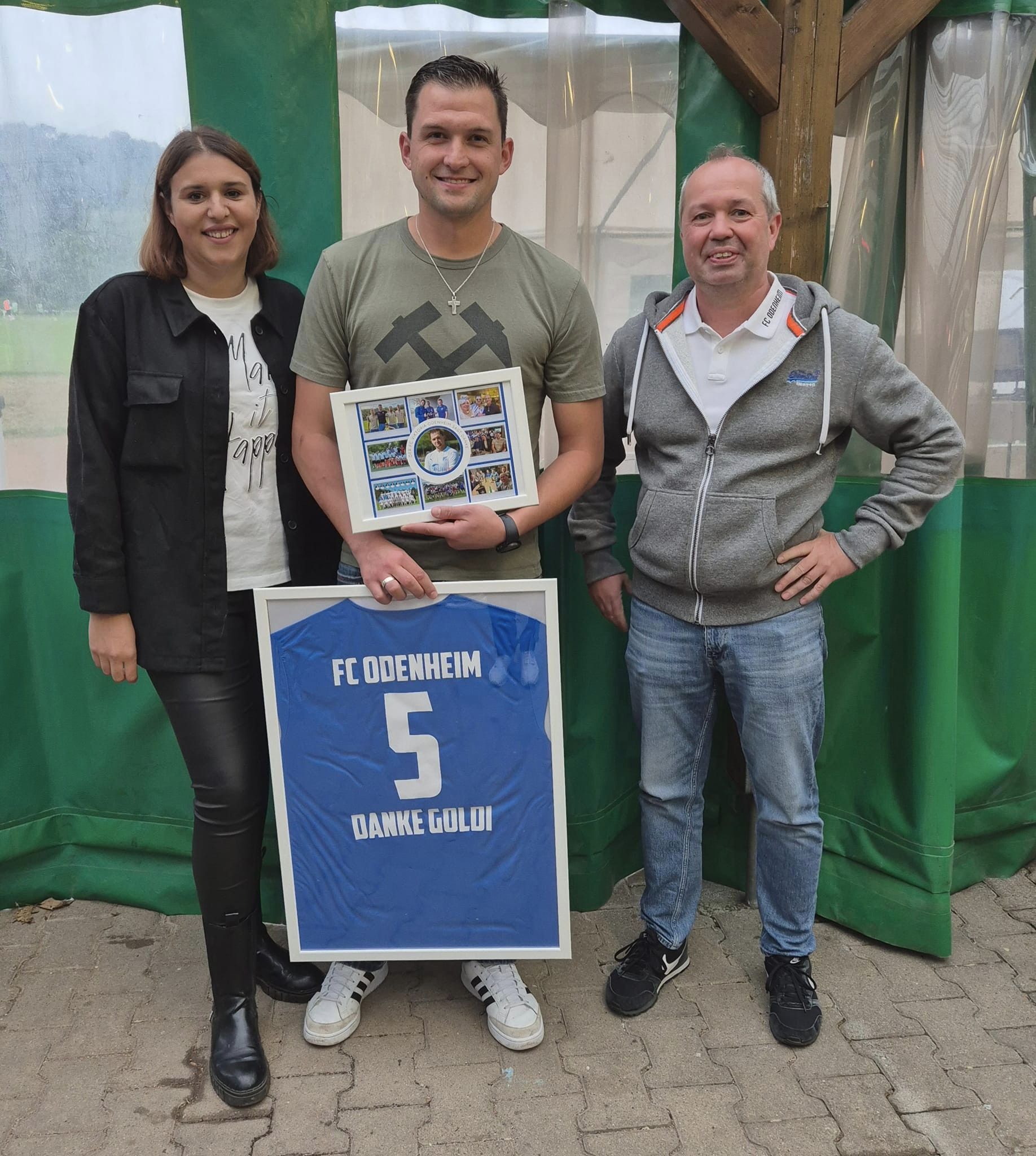 Marcel ist inzwischen eng mit unserem Odenheim verwachsen. Der Familienvater ist mit der Ur-Odenheimerin Angelina, geb. Veith (Gasthaus Zum Ochsen) verheiratet, hat hier gebaut und arbeitet als Industriemechaniker bei eimem unserer Sponsoren, der örtlichen Fa. Ritz Maschinenbau GmbH. Gerade auch deshalb hoffen wir sehr, dass er unserem Verein, in welcher Form auch immer, erhalten bleibt. Zuerst möchte sich "Goldi" aber mehr seiner Familie widmen.