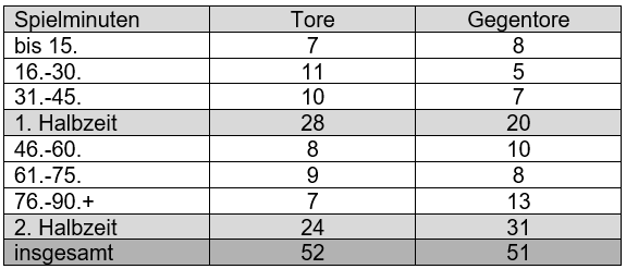 Vergleicht man jedoch die beiden Halbserien (hier aus der Tabelle nicht explizit rauslesbar, siehe hierzu bei Interesse auch den Halbjahresrückblick), relativiert sich das Ganze etwas: Die erzielten Tore waren in der 1. Halbzeit gleich, sowohl in Teil 1 als auch in Teil 2 der Saison netzte man hier jeweils 14mal ein. Im 2. Teil der Saison war die Performance in den zweiten 45 Minuten in Sachen Defensive jedoch besser. Hatte man in Teil 1 der Saison hier noch 19 Gegentreffer kassiert, so konnte man diesen Wert in Teil 2 auf 12 drücken. Zudem wurde es hinsichtlich der Steherqualität besser. Nach in Teil 1 einem ab Minute 76 Torverhältnis von 2:8 kam man – diesen Zeitraum betrachtet – im Jahr 2024 immerhin auf 5:5 Tore. Auch in der Phase zwischen den Minuten 61 und 75 steigerte man sich von 4:6 auf 5:2.