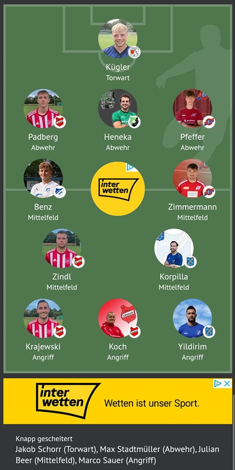 In die Elf der Woche für Spieltag Nr. 8 (2:0-Sieg in Stettfeld) wurde von unserem FCO Luis Benz berufen. Zudem sind Jakob Schorr, Max Stadtmüller und Julian Beer nur knapp am Einzug in die Elf der Woche gescheitert.