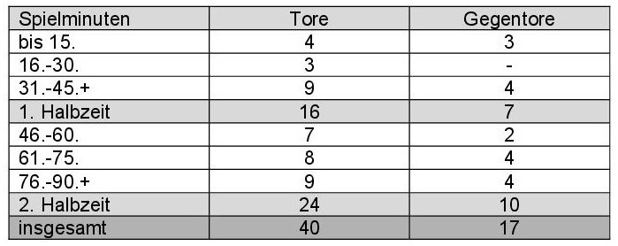 Ansonsten verteilen sich sowohl Tore als auch Gegentreffer in den weiteren unterteilten Phasen nahezu gleich, d.h. zwischen 7 und 9 eigene Treffern je Viertelstunde und dabei zwischen 2 und 4 Gegentreffer.