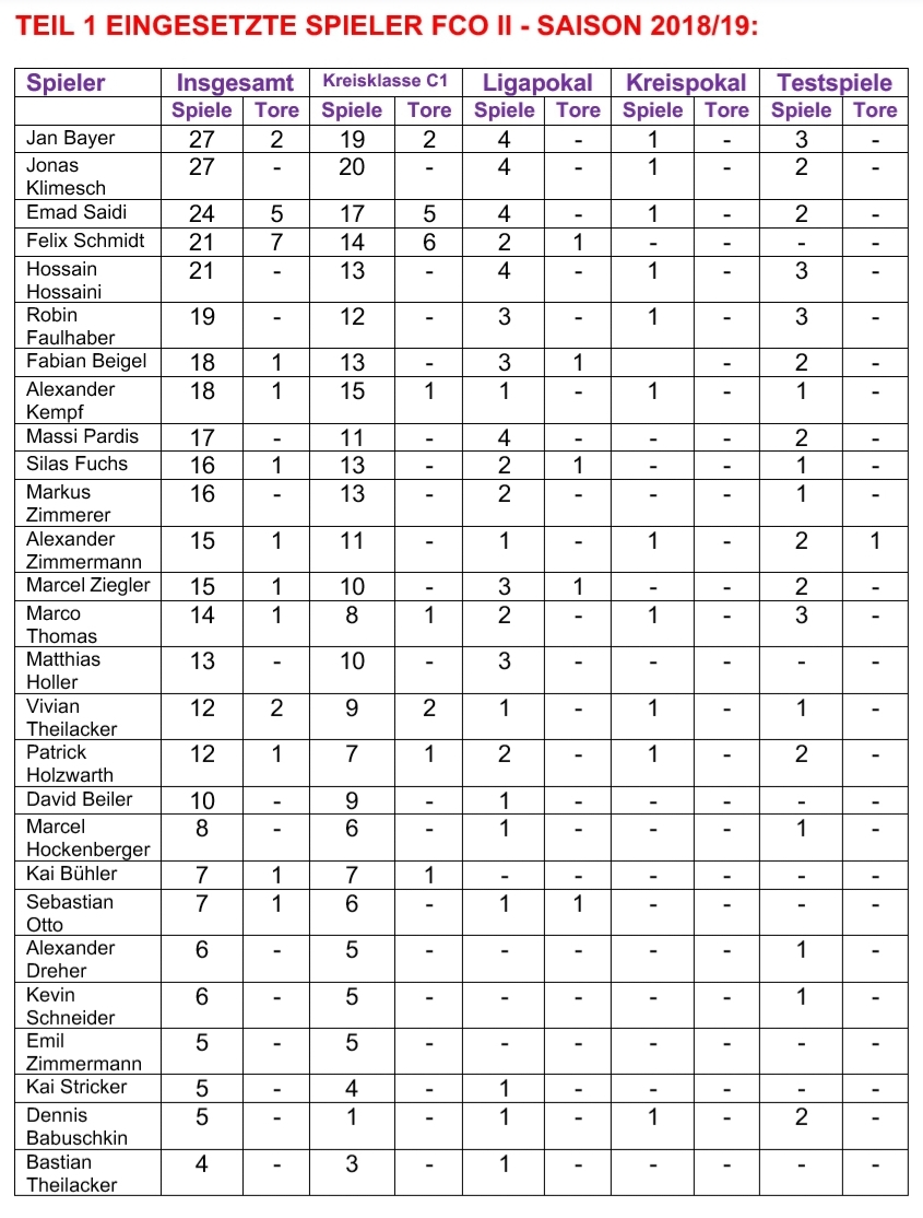 Die meisten Spiele bestritten Jan Bayer und Jonas Klimesch mit 27 von 28 möglichen Einsätzen – eine tolle Quote. Klimesch kam dabei in allen 20 Pflichtspielen zum Einsatz, Bayer fehlte einmal wegen einer Spielsperre. Auf immerhin 24 Einsätze kam Emad Saidi und auf je 21 kamen Felix Schmidt und Hossain Hossaini.