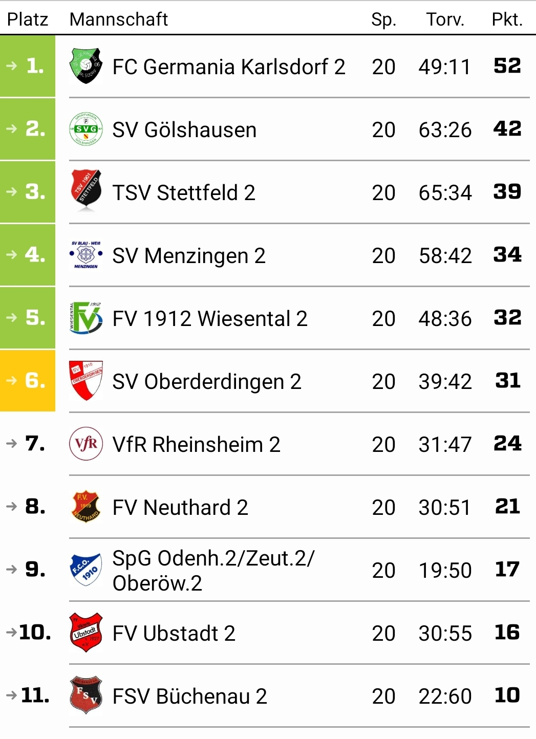 Mit einem folgenden 2:0-Sieg beim FV Neuthard II konnte man den Traum am Leben halten, jetzt waren´s nur noch 4 Punkte Rückstand zu Platz 5 und deren 2 zu Rang 6. Alles war nun wieder drin … Der Heimbegegnung gegen den Vierten SV Oberderdingen II kam nun besondere Bedeutung zu. Zudem konnte man recht selbstbewusst in selbige gehen, hatte man diesen Gegner doch in der Vorrunde mit 2:1 geschlagen und ihm im Ligapokal ein 1:1-Unentschieden abgetrotzt. Man spielte schließlich erneut Remis, dieses Mal 0:0, was aber zu wenig war, vergrößerte sich doch dadurch der Rückstand auf Platz 5 auf 6 Punkte und der auf Rang 6 auf deren 4.