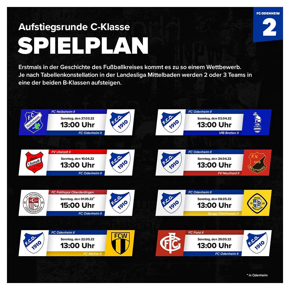 In der Staffelsitzung vom 21.03. wurde der Spielplan für die am kommenden Wochenende beginnende C-Klassen-Aufstiegsrunde zwischen dem Fußballkreis und den beteiligten Vereinen abgestimmt. Selbstverständlich kann es noch im Laufe der Wochen zu zeitlichen Verschiebungen kommen, aber zumindest vorerst sind folgende Spiele für unsere 2. Herrenmannschaft fix: