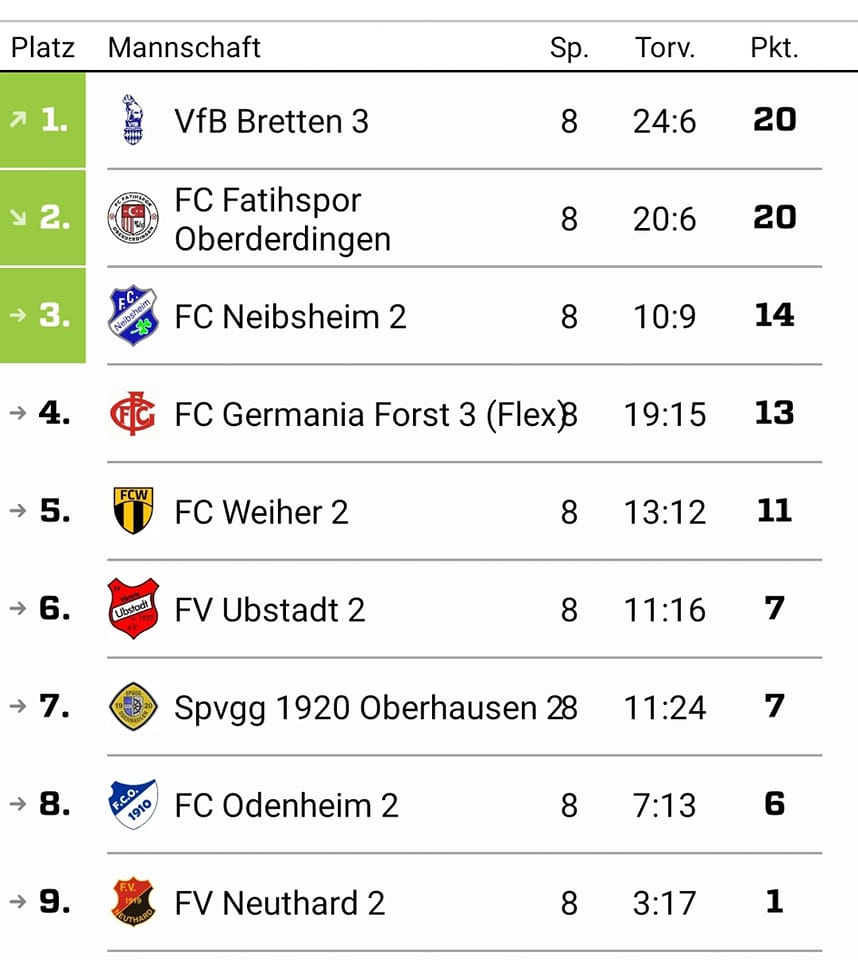 Die weiteren Platzierungen: 4.) FC Forst III 13 Punkte, 6.) FV Ubstadt II 7 Punkte, 7.) Spvgg Oberhausen 7 Punkte, 8.) Unser FCO II 6 Punkte (6 Unentschieden in 8 Spielen), 9.) FV Neuthard 1 Punkt.