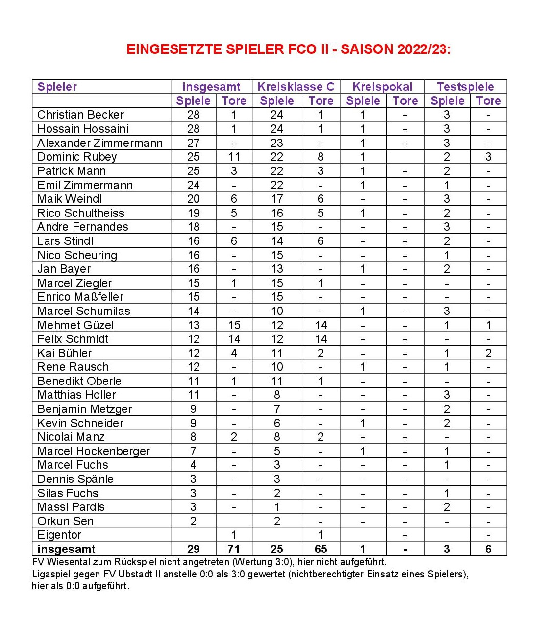 30 Kicker schnürten für unsere Zweite in dieser Saison die Kickschuhe, jeder davon bestritt mindestens ein Spiel in der Kreisklasse C. Bestwert von insgesamt 25 ausgetragenen C-Klassen-Spielen: Christian Becker und Hossain Hossaini (24, jeder verpasste also nur eine Begegnung) vor Alexander Zimmermann (23) und mit je 22 Patrick Mann, Dominic Rubey und Emil Zimmermann. 14 weitere Spieler kamen noch auf eine zweistellige Anzahl an Ligaeinsätzen. Inkl. Pokal und Tests sieht es nahezu gleich aus: Von 29 Becker und Hossaini je 28, dann A. Zimmermann 27, danach Mann und Rubey je 25 sowie E. Zimmermann 24. Auf noch 20 kam Maik Weindl. Siehe hierzu auch beigefügtes Foto „Eingesetzte Spieler“.
