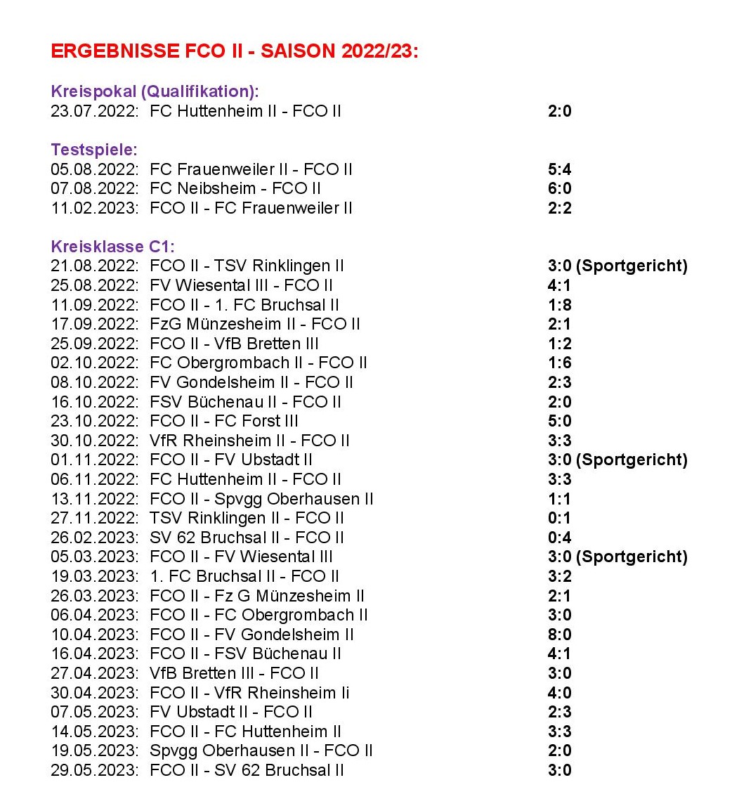 Zum Jahresende 2022 nahm unser FCO II nach 14 von ursprünglich 28 Saisonspielen (13 x Vorrunde, 1 x Rückrunde) den 7. Tabellenplatz ein, mit 6 Siegen, 3 Unentschieden, 5 Niederlagen, damit 21 Punkten und 32:28 Toren. Bei Bereinigung um das später aus der Wertung fallende Forst-Spiel: Platz 5, 5 S, 3 U, 5 N, 18 Punkte, 27:28 Tore.