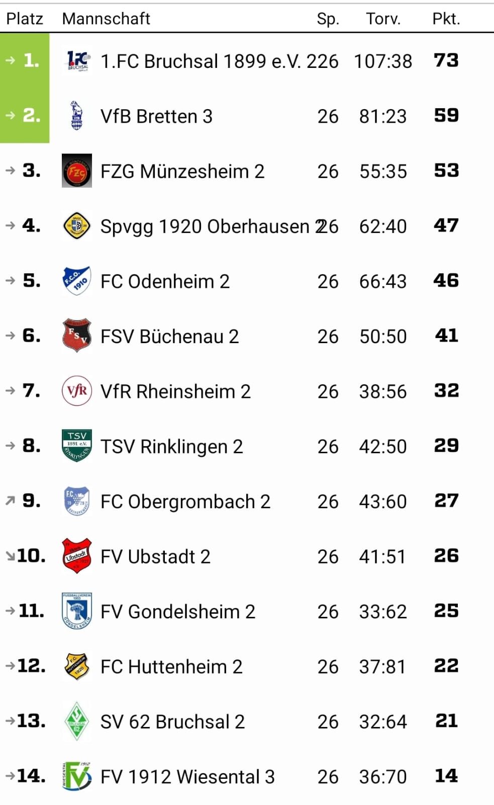 Bei für diesen nur noch 2 ausstehenden Spielen war der FSV Büchenau mit nun 9 Punkten Rückstand aus dem erweiterten Aufstiegsrennen raus und um den ominösen 4. Platz buhlten nun nur noch Oberhausen II (44 Punkte) und unser FCO II (42 Punkte).