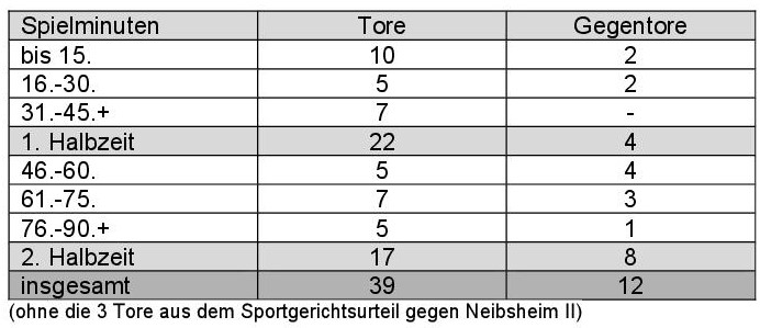 Unser Team performte gerade in den jeweiligen ersten Halbzeiten richtig gut, hier erzielte 22 Tore (mit 10 die meisten in der Anfangsviertelstunde) und musste nur 4, gegenüber in Durchgang 2 deren 8 Gegentore einstecken. Von den 4 Gegentoren in den ersten Halbzeiten kassierte man deren 3 gegen die Spitzenteams Philippsburg II und Langenbrücken II, sonst nur noch eines beim 9:1-Sieg gegen Oberderdingen. In der Viertelstunde vor der Pause ließ die Bayer-/Hausknecht-Elf überhaupt kein Gegentor zu. Mit nur einem Gegentreffer stand man auch in der jeweiligen Schlussviertelstunde recht stabil, diesen einen Gegentreffer gab es nur im 1. Spiel beim 0:1 gegen Gondelsheim II und dieser hatte eigentlich auch noch irregulären Charakter.