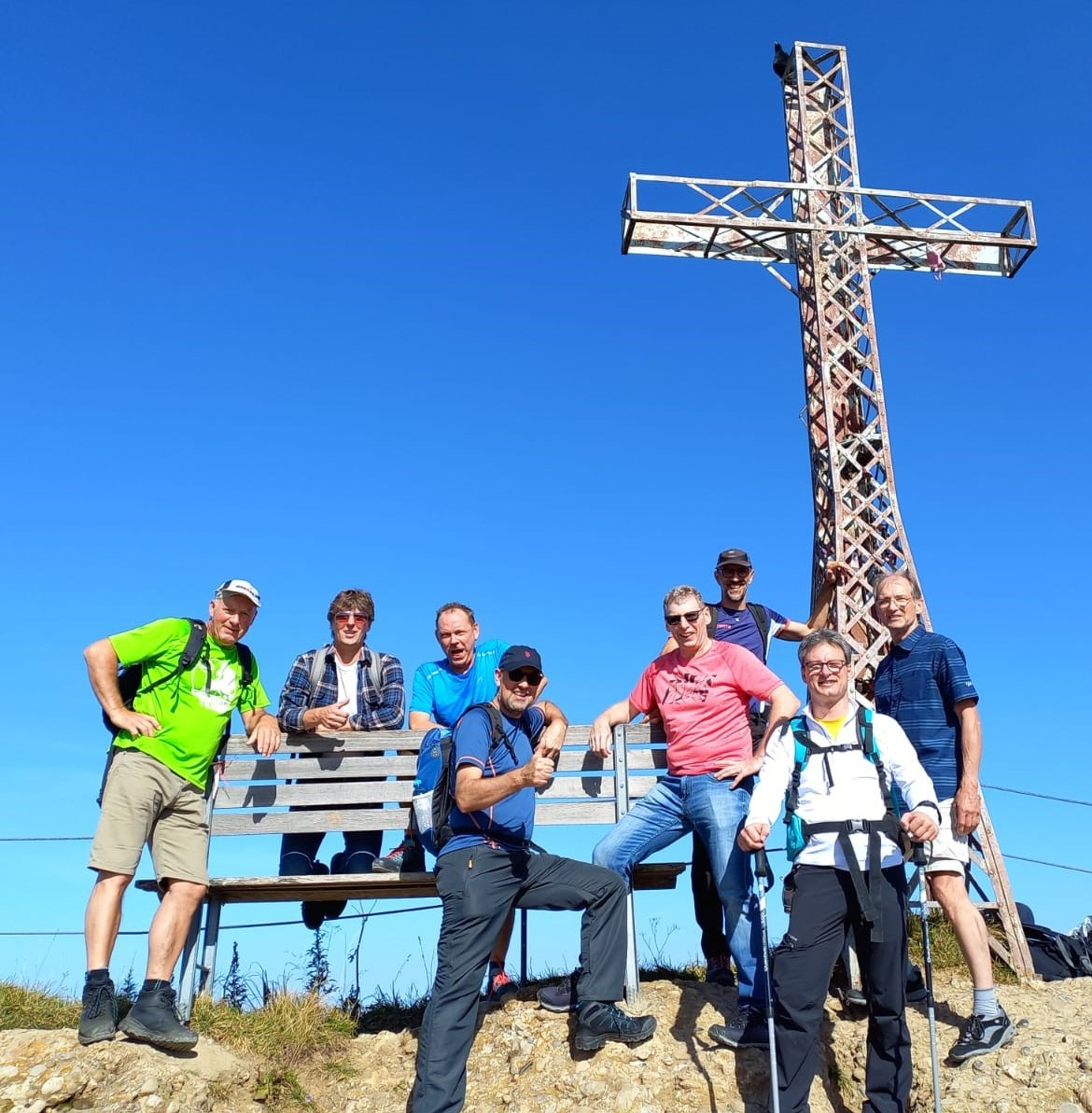 Nach einem ausgiebigen Frühstück am frühen Samstagmorgen schnallte unsere AH-Wander-Truppe bei herrlichem Wetter die Wanderstiefel, um pünktlich von unserem Startpunkt der Talstation am Oberstaufener Hausberg, dem Hochgrat, zu starten. Nach kurzer Fahrt mit der Seilbahn zur Bergstation wurde danach der Hochgrat-Gipfel mit seinen 1834 m Höhe in Angriff genommen. Nach Erreichen des Gipfels und dem obligatorischen Foto ging die Bergtour über die Brunnenau-Scharte, Gütlealpe und der Alpe Obergelchenwang auf steinigem und teils sehr steilem Gelände zurück zur Bergstation. Der steile Abstieg zu Fuß wurde danach über das Staufner-Haus, der Oberen und Unteren Lauchalpe mit jeweiliger gemütlicher Einkehr und dem Kauf von Allgäuer Käse direkt von der Sennalpe Mittelberg bewältigt. Der Abschluss der Bergtour wurde dann in der urigen und weit über die Grenzen Oberstaufens hinaus bekannten 110 Jahre alten „Alpe Mohr“ vorgenommen.