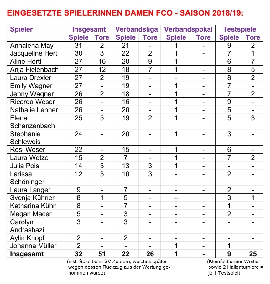Unsere FCO-Amazonen bestritten inklusive der aus der Wertung genommenen VL-Vorrundenbegegnung in Zeutern 22 Verbandsligaspiele, ein Pokalspiel und sechs Testspiele. Hinzu kamen drei (Hallen)turniere. Bei diesen insgesamt 32 Auftritten war Kapitänin Annalena May 31 Mal mit dabei, fehlte also insgesamt nur ein einziges Mal Platz 2 belegt Jacqueline Hertl, die auf 30 Einsätze kommt, dabei aber als einzige Spielerin alle 22 Verbandsligaspiele bestritt. Vier Spielerinnen kommen wettbewerbsübergreifend auf je 27 Einsätze (Aline Hert, Anja Fielenbach, Laura Drexler und Emily Wagner), drei auf deren 26 (Jenny Wagner, Ricarda Weser, Nathalie Lehner).