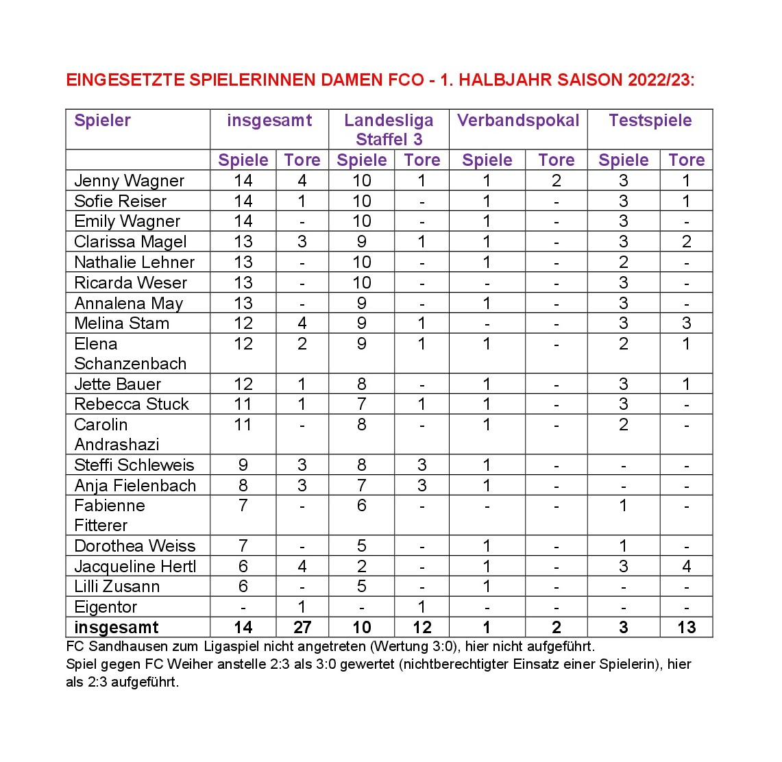 Beste Torschützinnen in der Landesliga Staffel 3 sind Chatzipurgani (Dielheim/Wiesloch) und Moira (Frauenweiler) mit je 16 Treffern. Beste FCO-Torschützinnen sind Anja Fielenbach und Stefffi Schleweis mit je 3 Treffern (Rang 19 in der Torjägerinnenliste), leider standen beide nicht in jedem Spiel zur Verfügung. Dies zeigt auf, wo unser Team in dieser Hinrunde am meisten der Schuh gedrückt hat, also in der Offensive. Die weiteren Ligatreffer erzielten Clarissa Magel, Elena Schanzenbach, Melina Stam, Rebecca Stuck und Jenny Wagner, hinzu kam ein Eigentor. Die gesamte bisherige Saison betrachtet (inkl. Vorbereitung und Pokal), kamen die lange Zeit verletzte Jacqueline Hertl, Stam und J. Wagner auf je 4 Treffer. Neben den je 3 Treffern von Fielenbach und Schleweis trafen insgesamt noch Magel (3), Schanzenbach (2) und je einmal Jette Bauer, Sofie Reiser und Stuck. Die meisten Torvorbereitungen in unseren Landesligaspielen gelangen Stam mit 3 vor Fielenbach und J. Wagner mit je 2. Auf je eine kamen Bauer, Reiser und Schanzenbach.