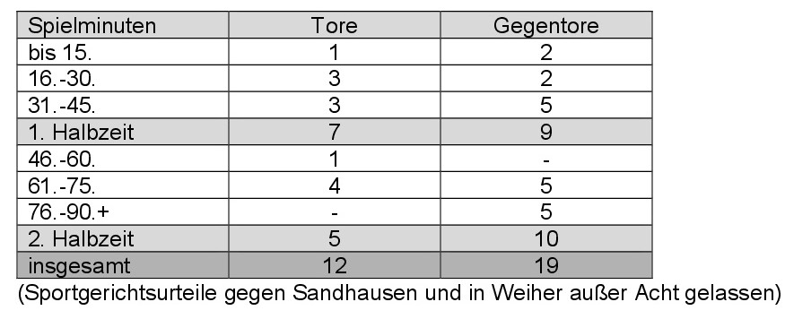Negativ auffällig ist es, dass in der Schlussviertelstunde inkl. Nachspielzeit, kein einziger Treffer gelungen ist und auch in der Anfangsviertelstunde nur ein einziger. Ansonsten verteilen sich die erzielten Treffer recht gleichmäßig. Zu Beginn der jeweiligen 2. Spielhälften ging´s auch in Sachen Gegentore, vor allem musste man in den jeweils ersten 15 Minuten der 2. Hälfte keinen Treffer hinnehmen. Zum Ende der beiden Spielhälften aber auch insoweit die Negativwerte! Vielleicht ein Ansatzpunkt in Sachen Fitness?