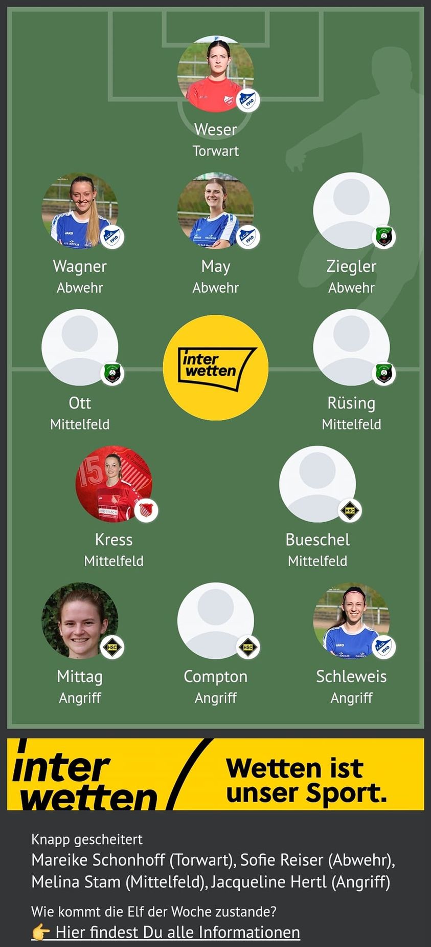 Auf dem Fußballonlineportal FuPa Bruchsal wird je Liga immer die „Elf der Woche“ bestimmt, so auch für die Landesliga Staffel 3, in der unser Damenteam an den Start geht.