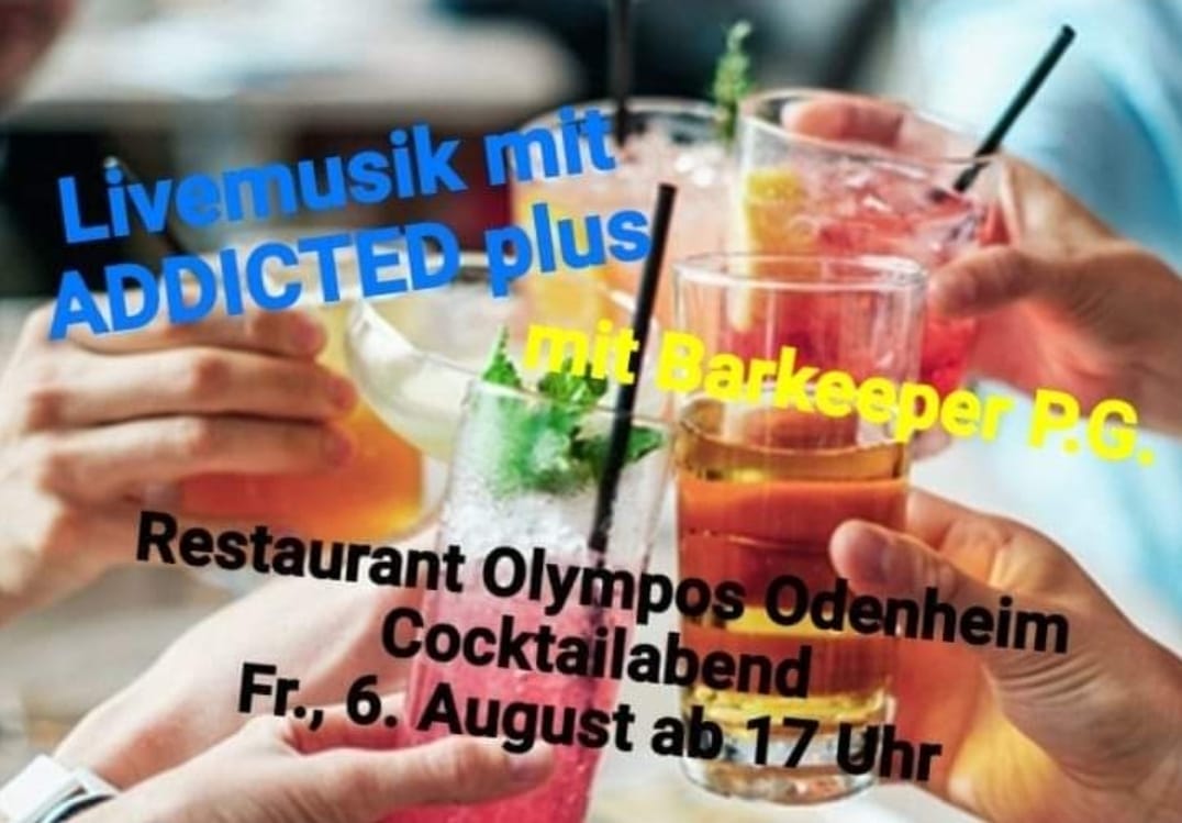 Das Restaurant Olympos, Am Felsenkeller 12 in Odenheim, lädt am Freitag, den 6. August ab 17.00 Uhr zum Event "Cocktailabend mit Live-Musik" mit Cocktailgenuss und Livemusik im idyllischen Biergarten ein (bei schlechtem Wetter Verlegung in den Innenbereich).