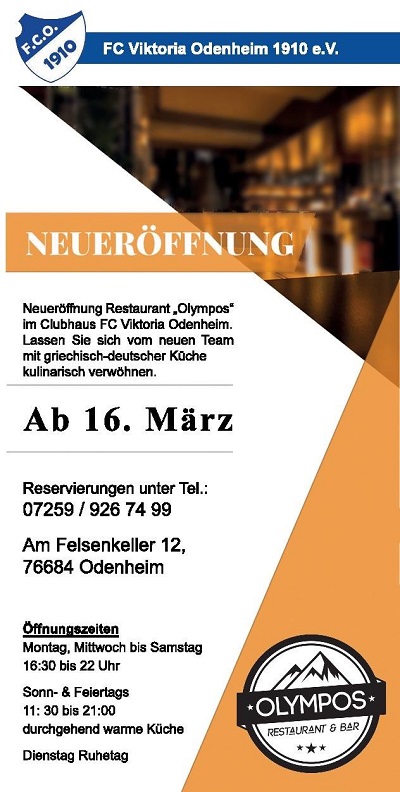 am 16. März 2019 ist es soweit – das „Restaurant Olympos“ öffnet um 18 Uhr seine Pforten im Clubhaus des FC Odenheim.